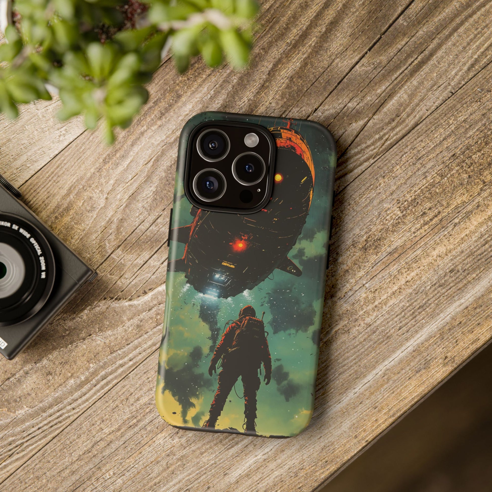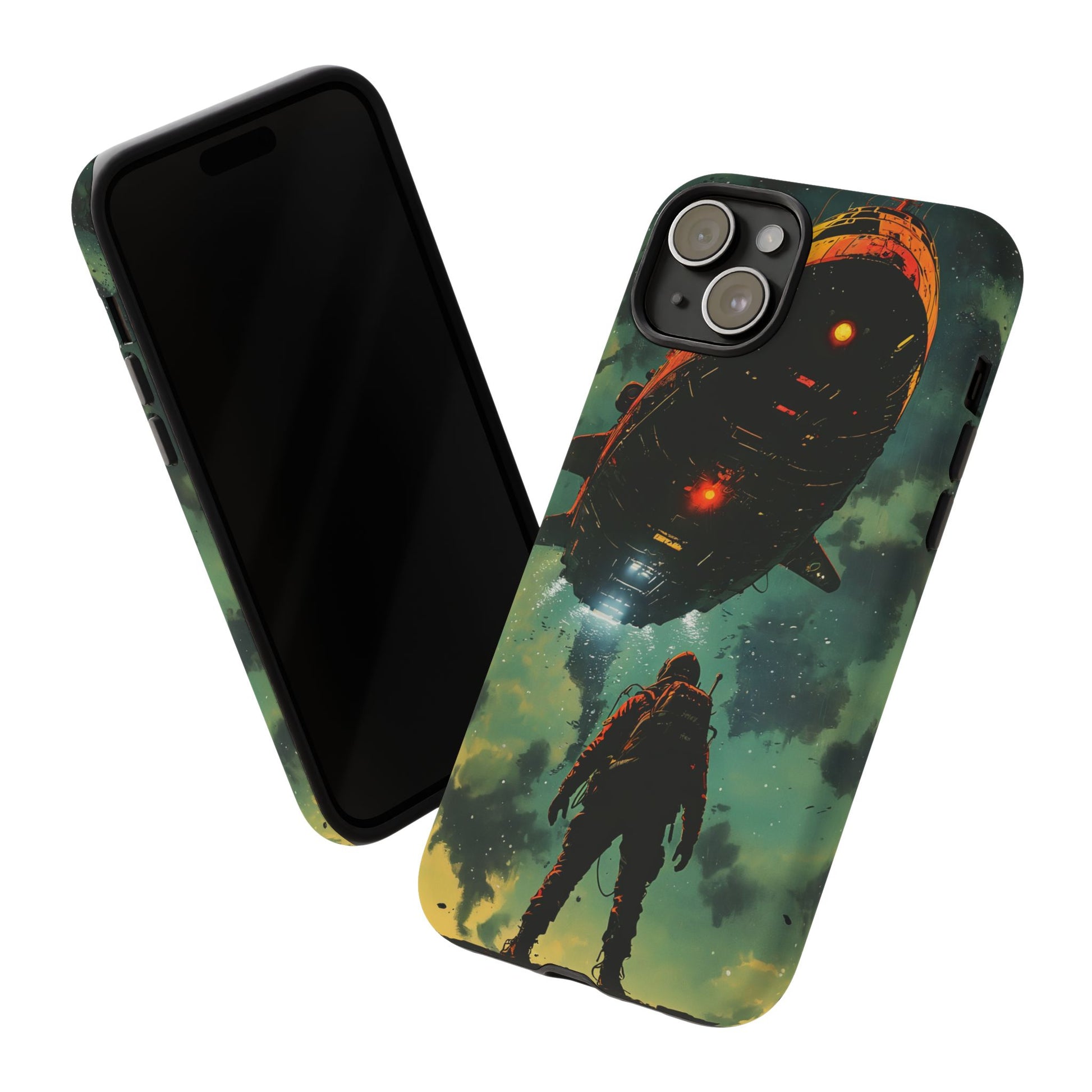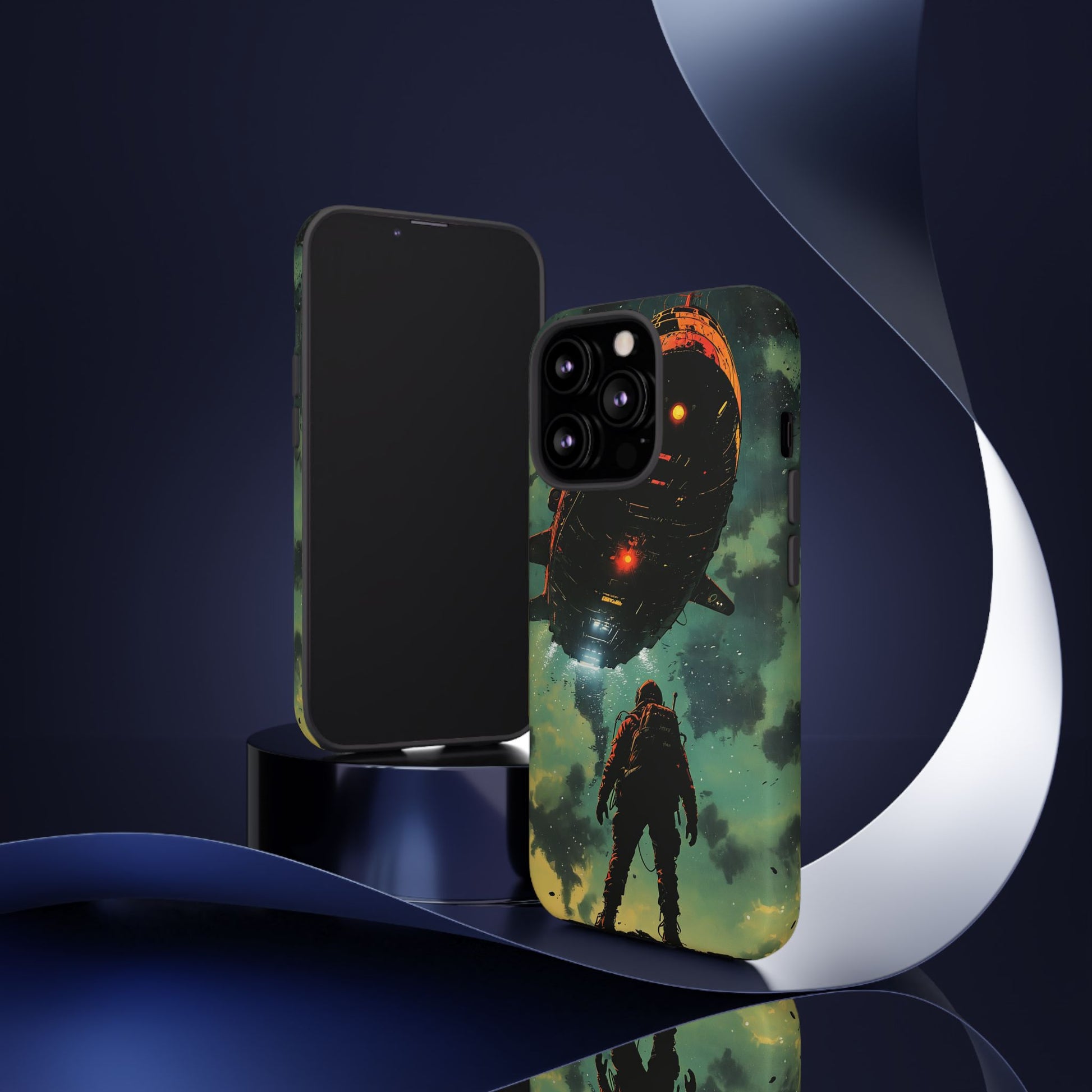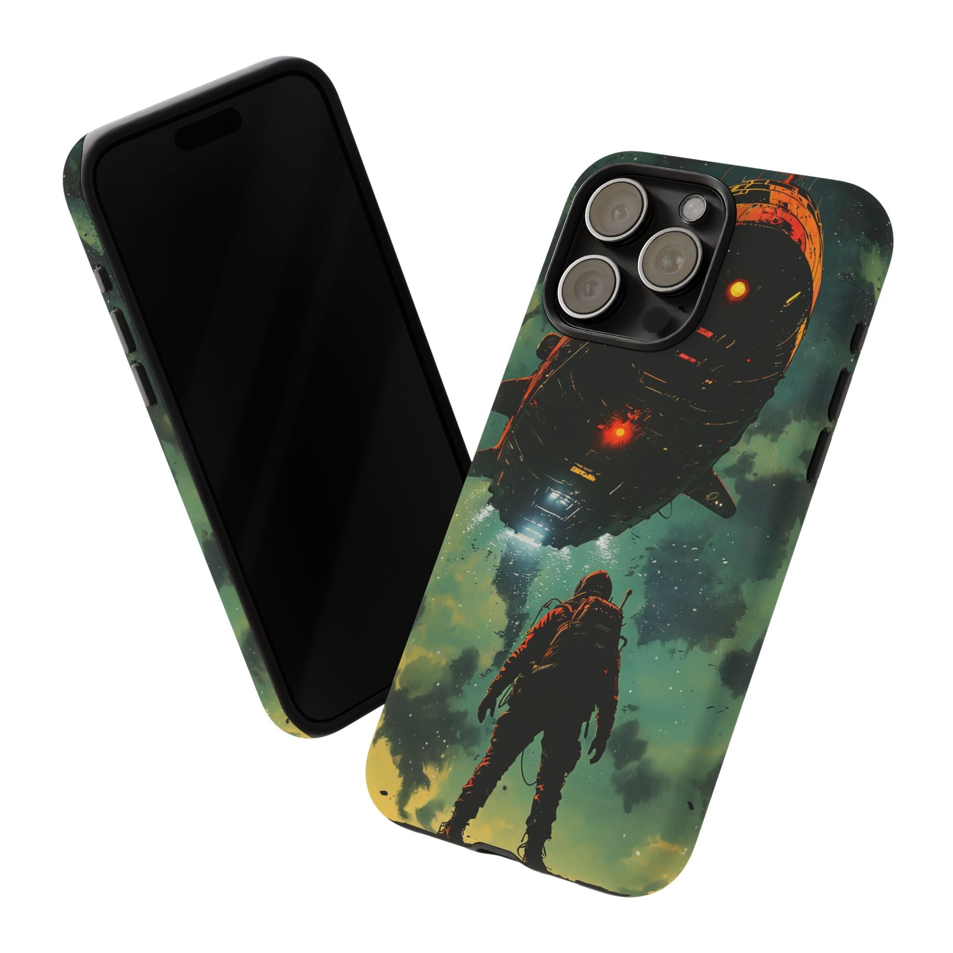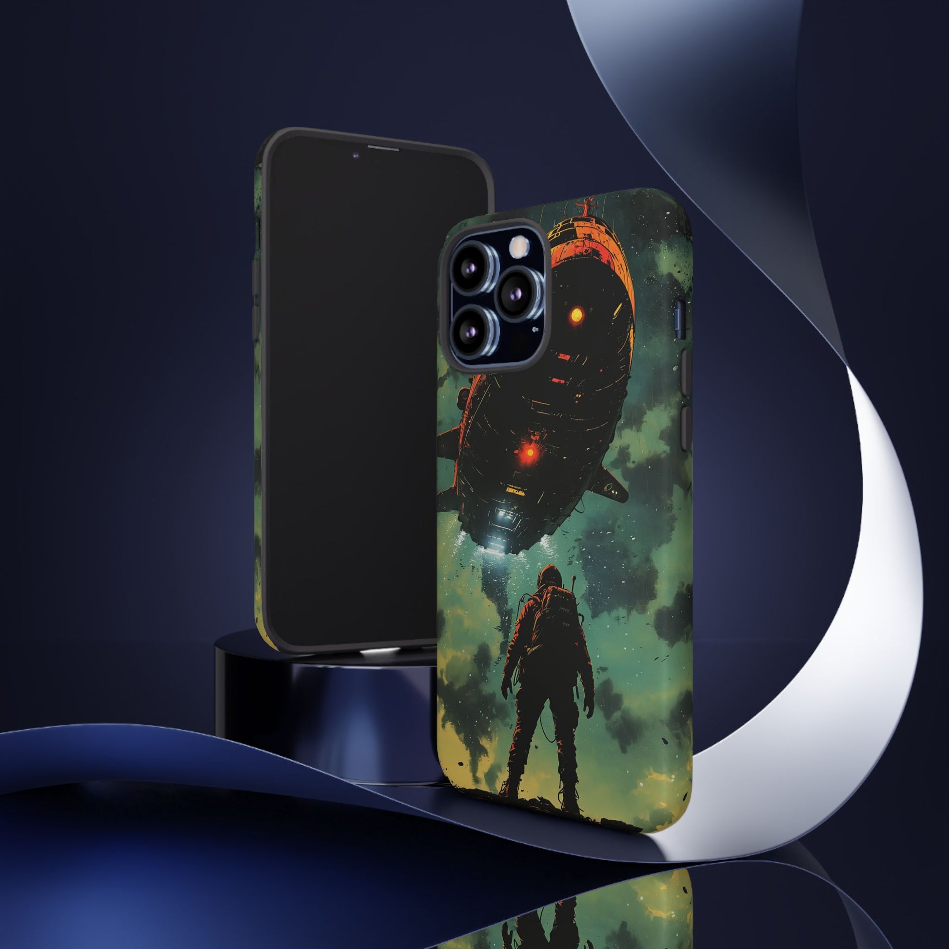 At the core of this design lies a portrayal of a lone spaceship, drifting through the vast, inky expanse of the universe. The ship is small against the backdrop of infinite darkness, emphasizing the themes of solitude and isolation. Its sleek, angular lines and dim, pulsating lights convey a sense of advanced technology and the stark realities of space travel.