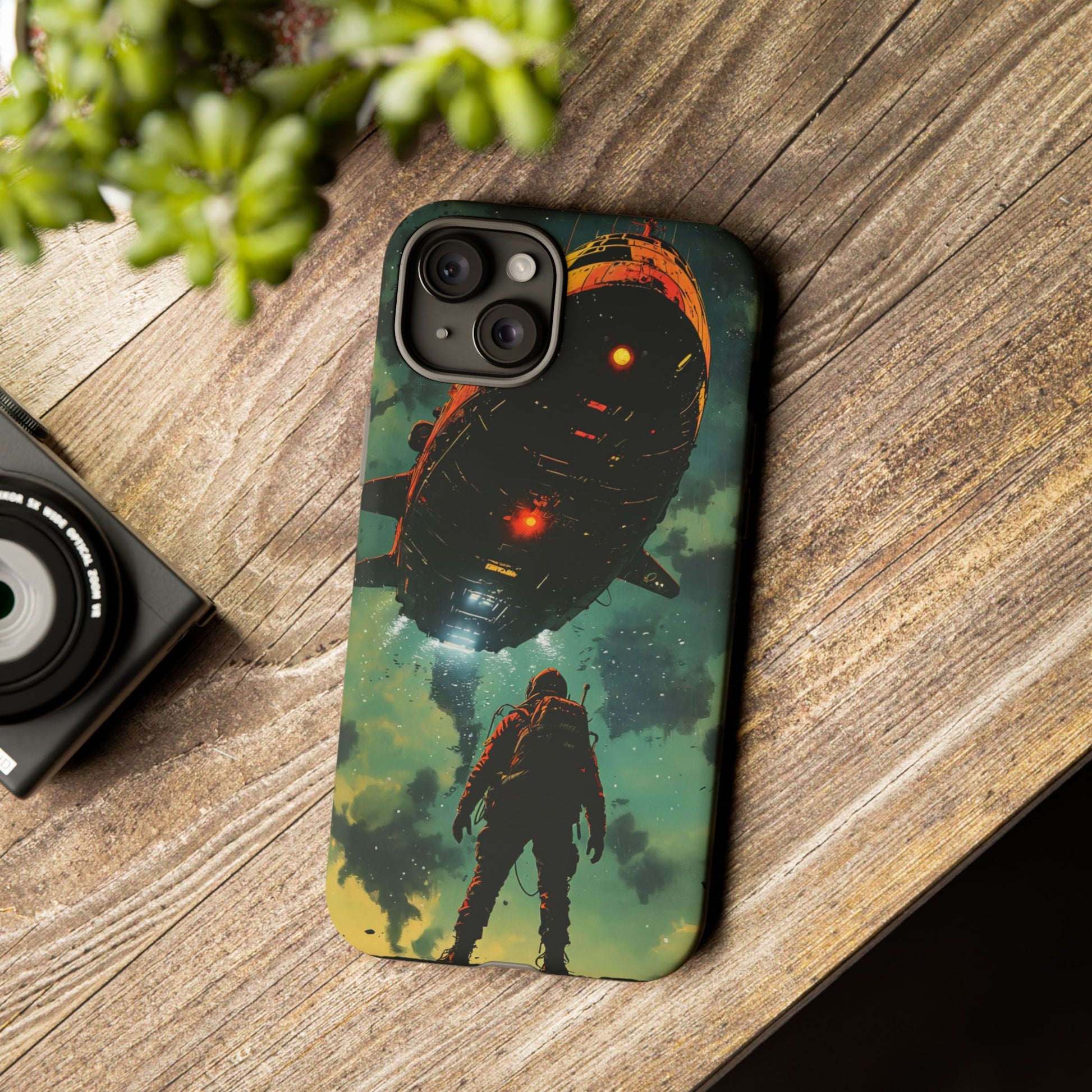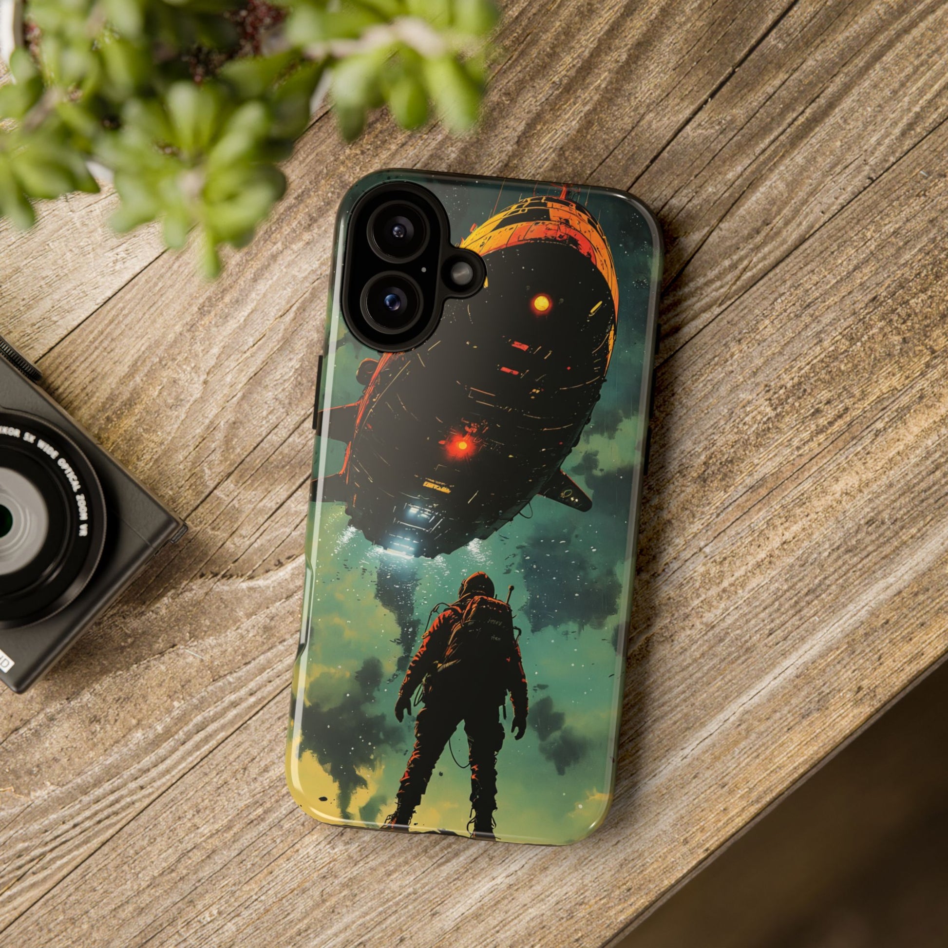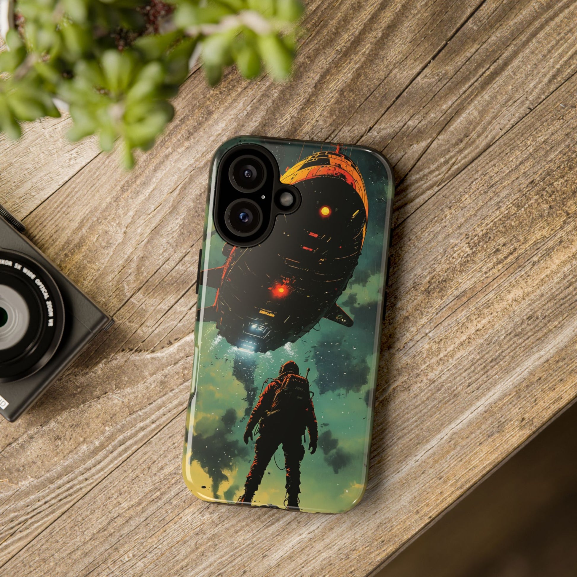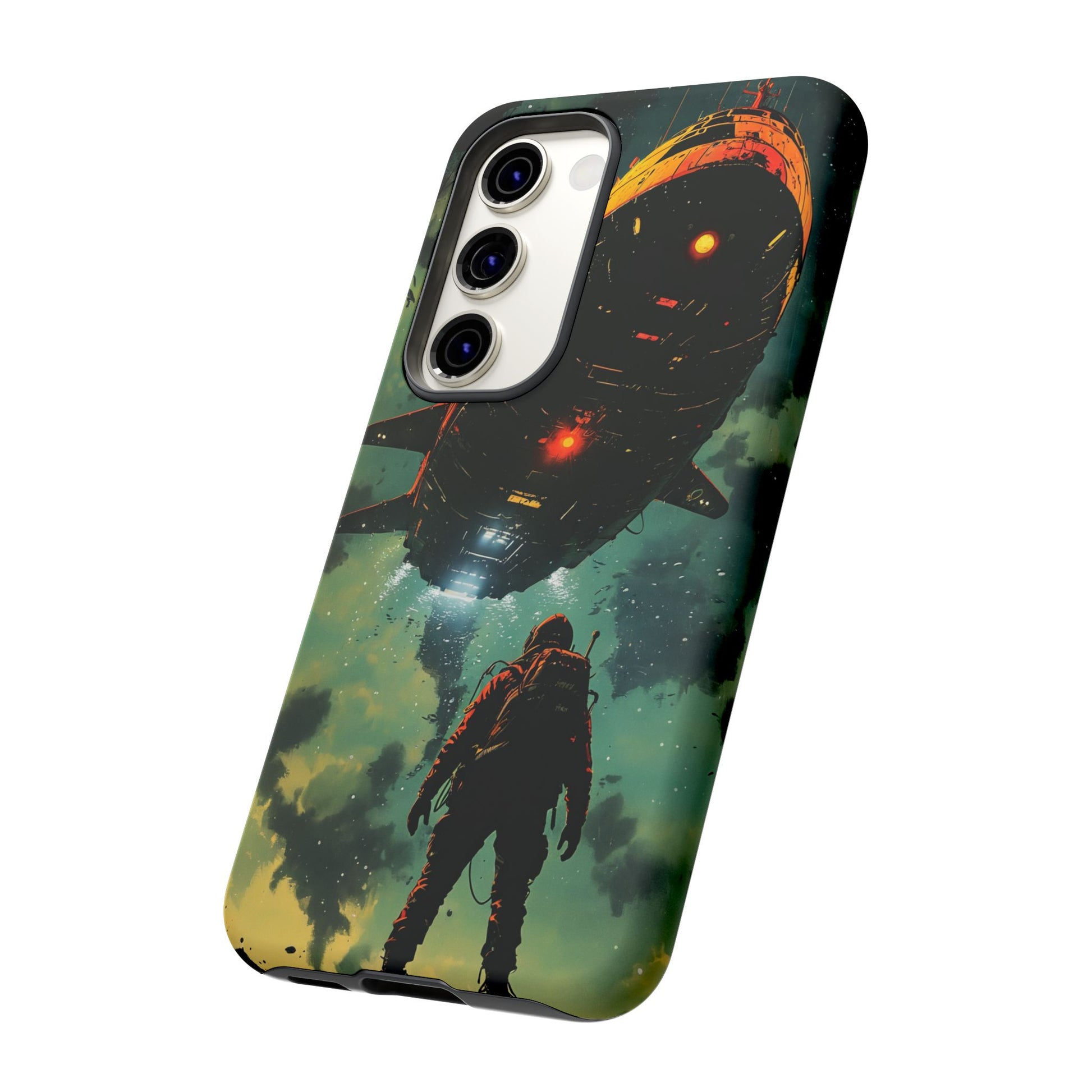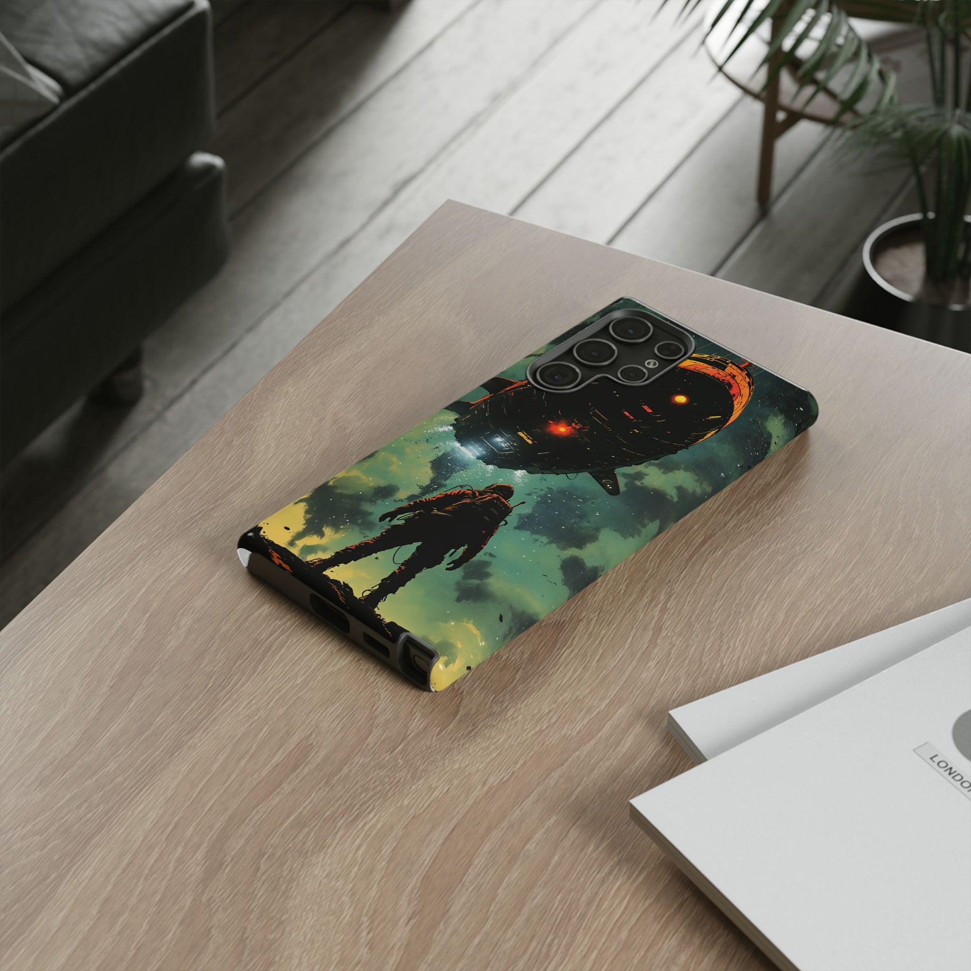 At the core of this design lies a portrayal of a lone spaceship, drifting through the vast, inky expanse of the universe. The ship is small against the backdrop of infinite darkness, emphasizing the themes of solitude and isolation. Its sleek, angular lines and dim, pulsating lights convey a sense of advanced technology and the stark realities of space travel.