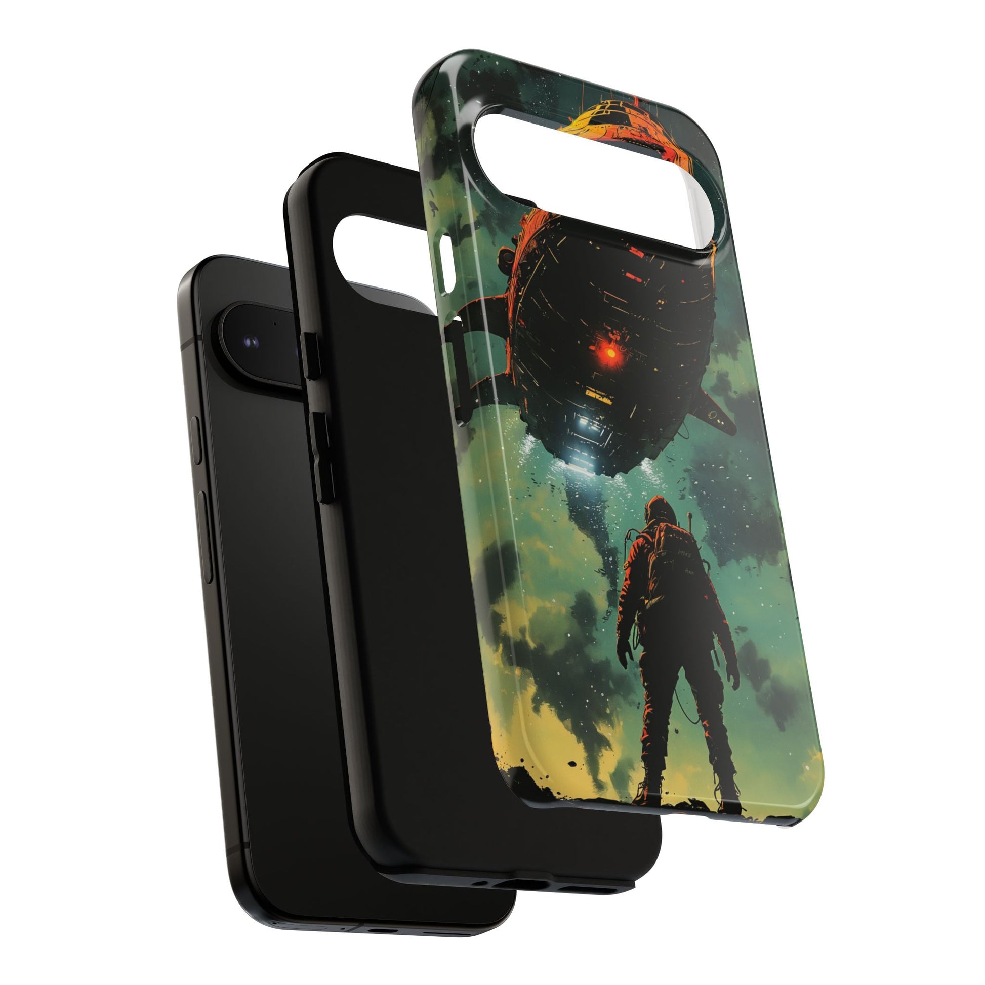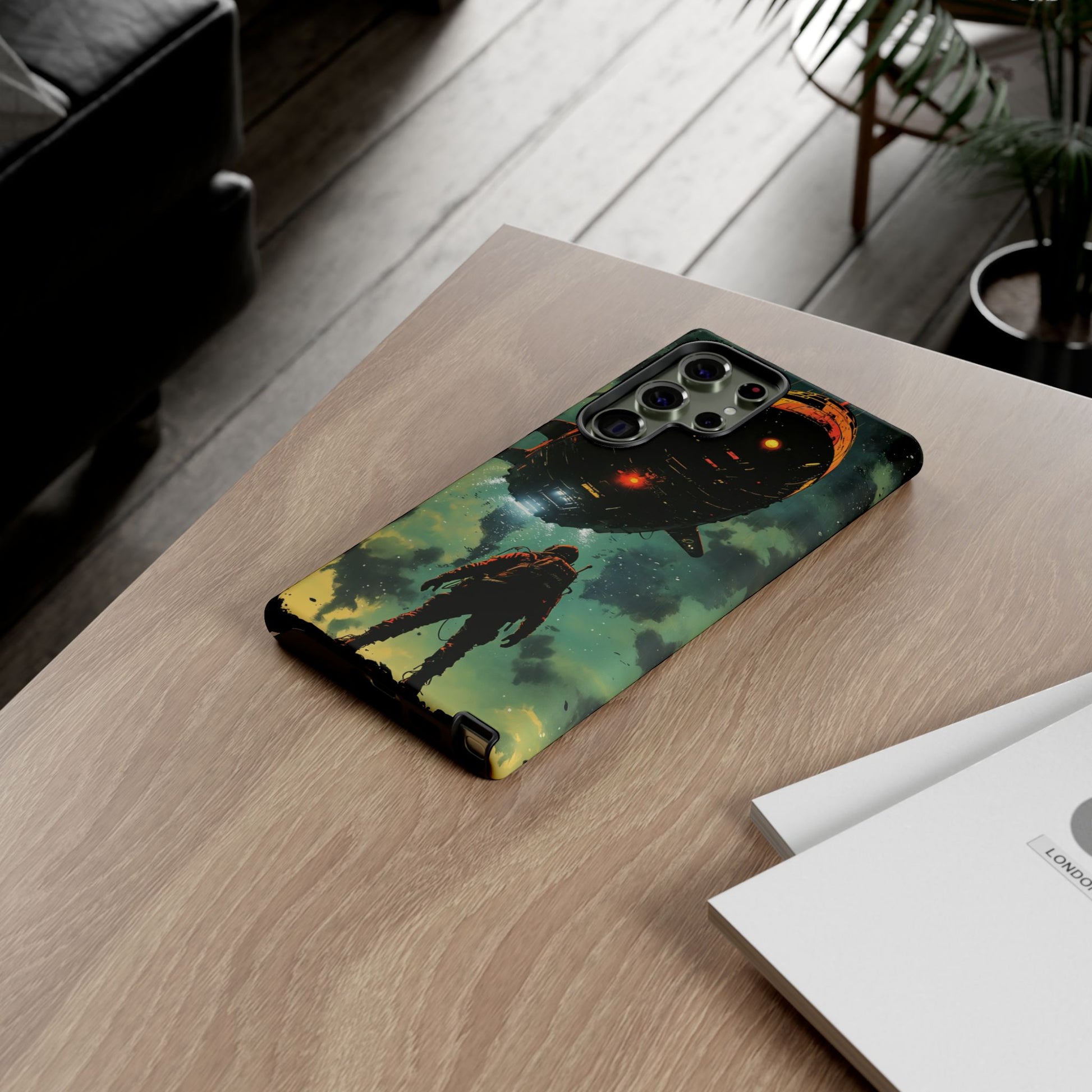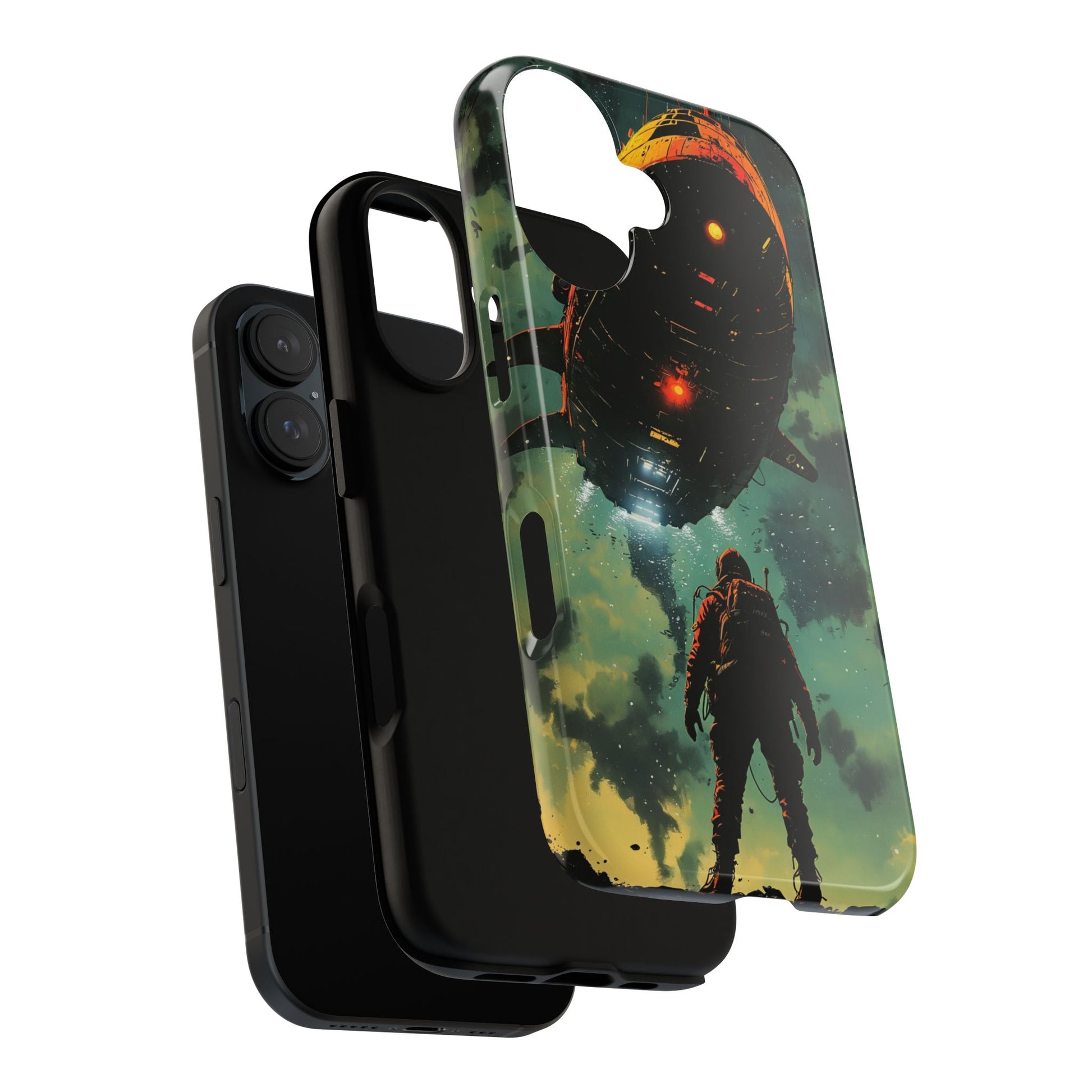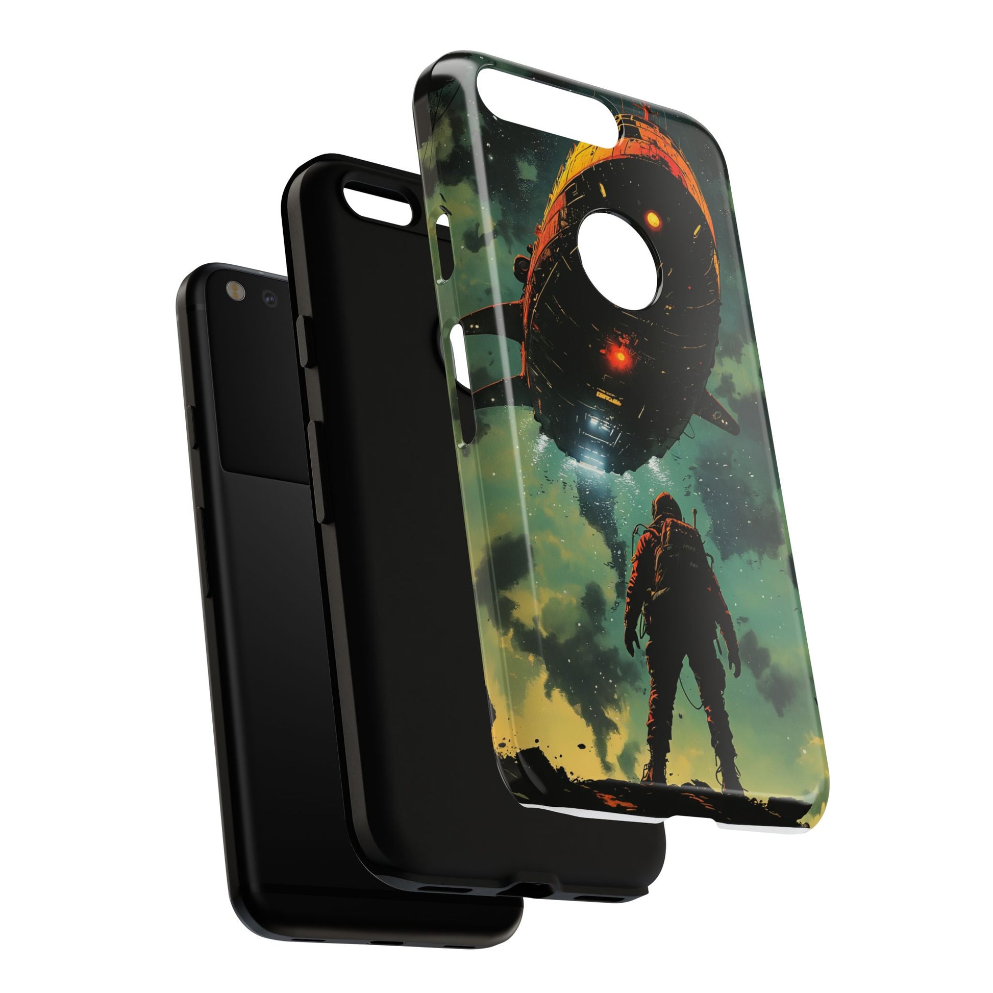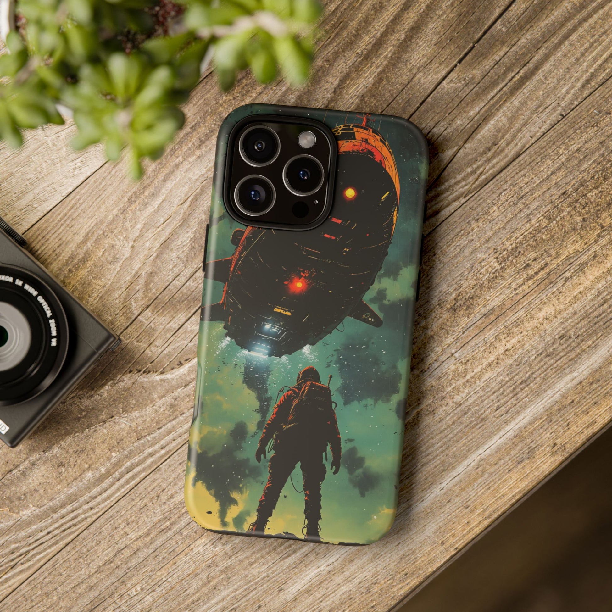 At the core of this design lies a portrayal of a lone spaceship, drifting through the vast, inky expanse of the universe. The ship is small against the backdrop of infinite darkness, emphasizing the themes of solitude and isolation. Its sleek, angular lines and dim, pulsating lights convey a sense of advanced technology and the stark realities of space travel.