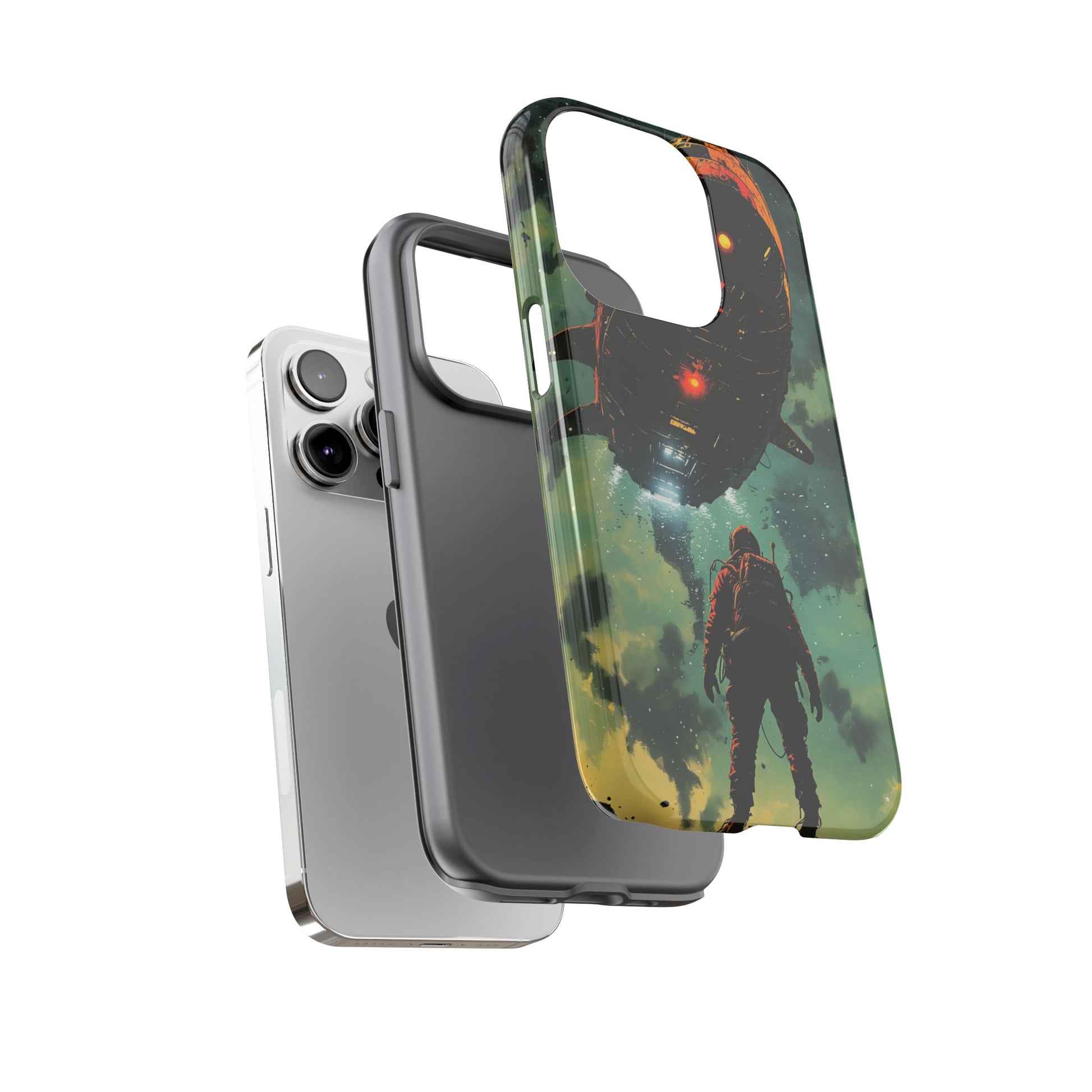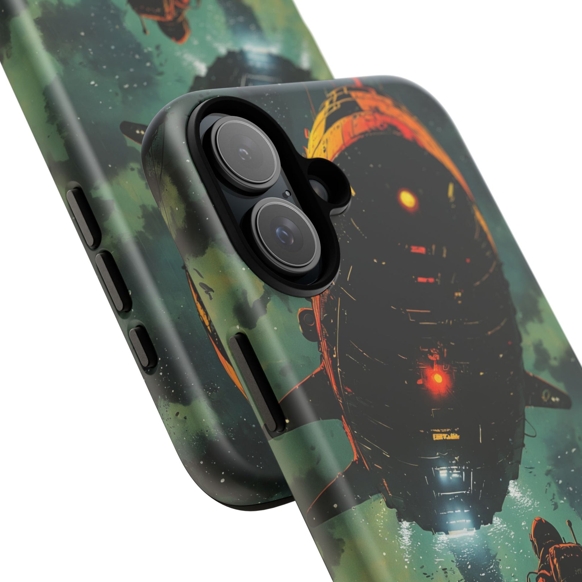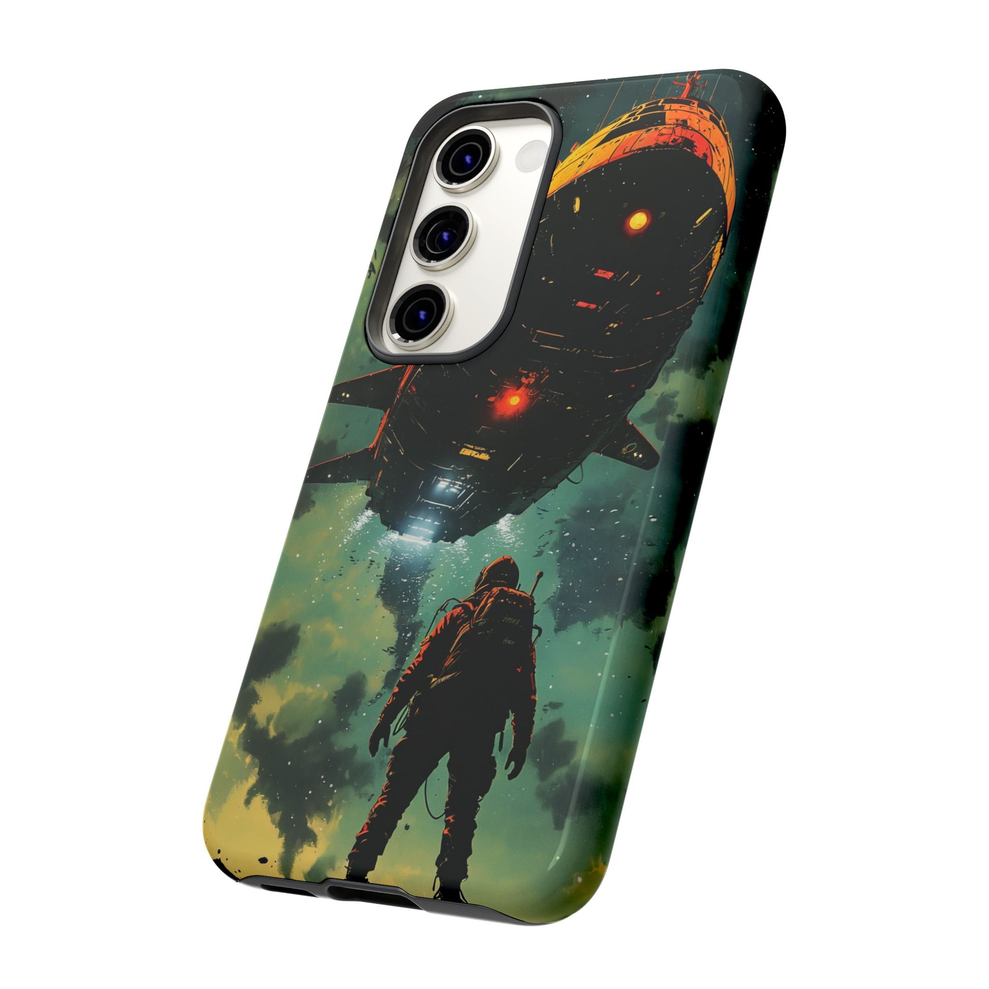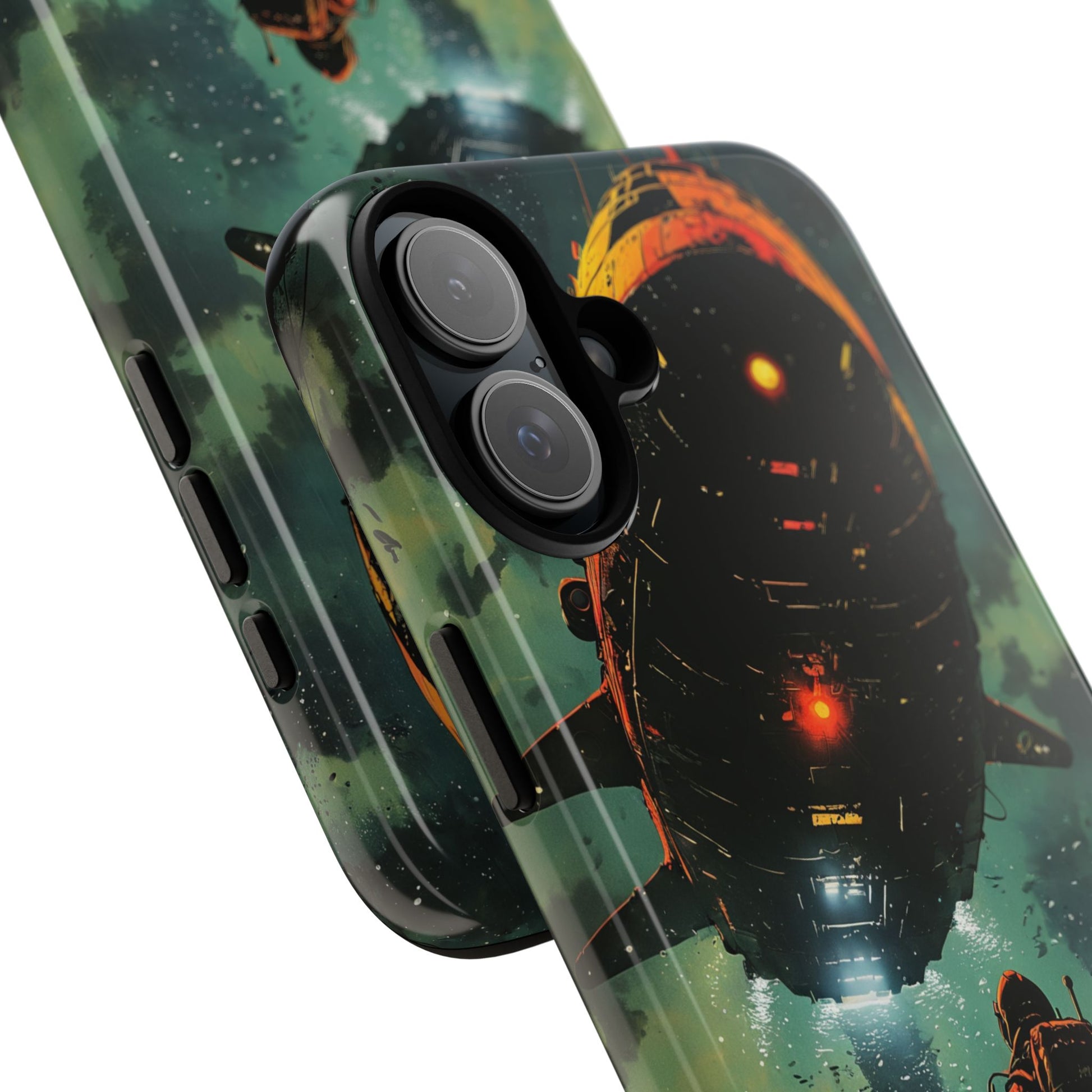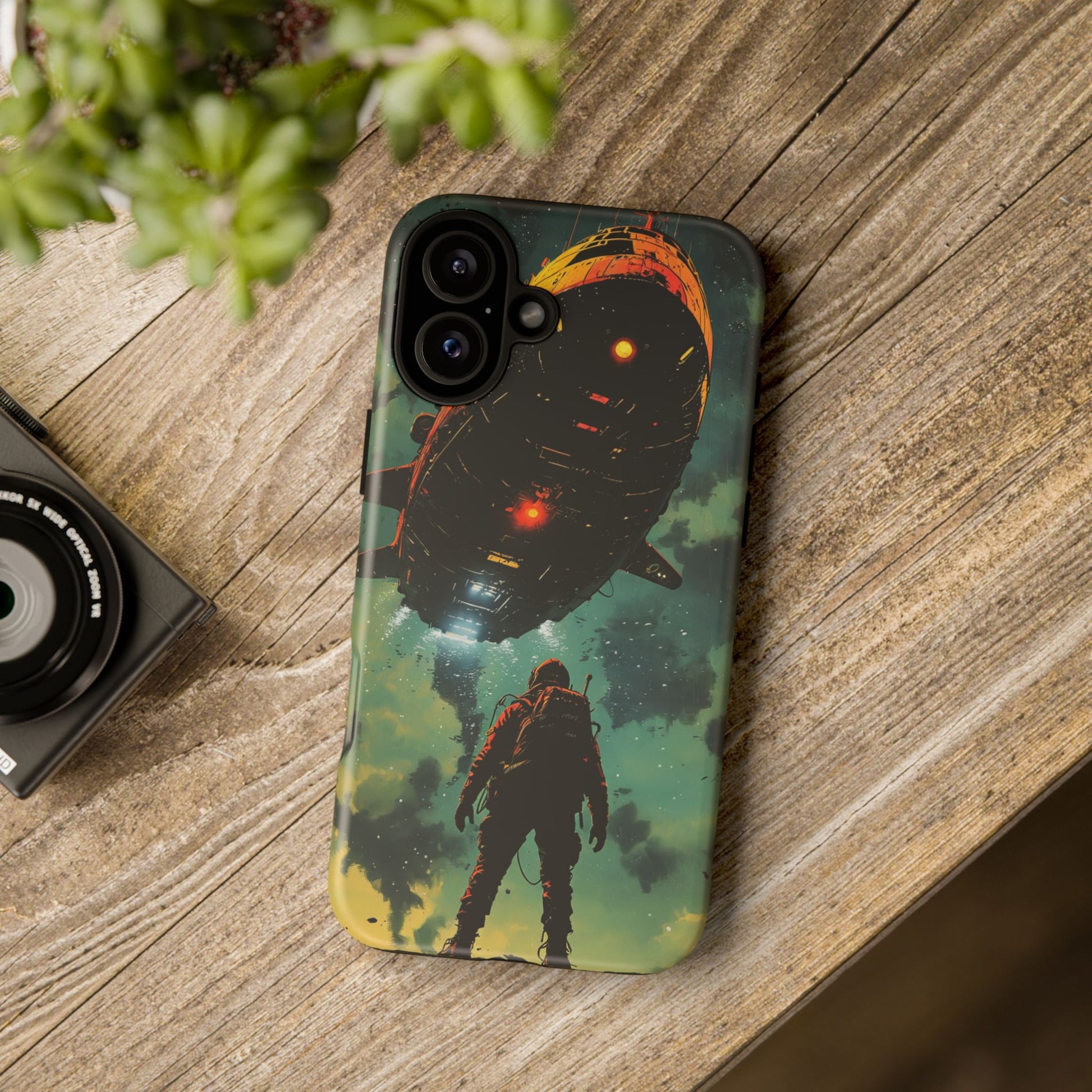 At the core of this design lies a portrayal of a lone spaceship, drifting through the vast, inky expanse of the universe. The ship is small against the backdrop of infinite darkness, emphasizing the themes of solitude and isolation. Its sleek, angular lines and dim, pulsating lights convey a sense of advanced technology and the stark realities of space travel.