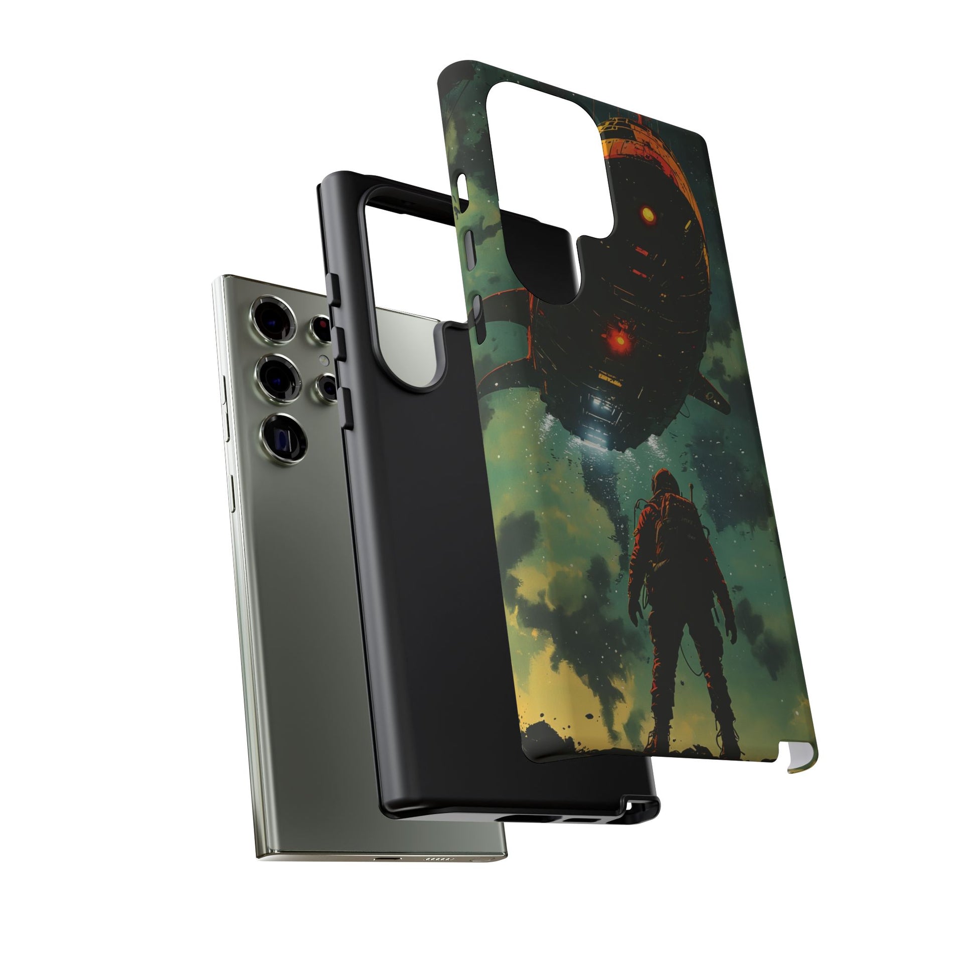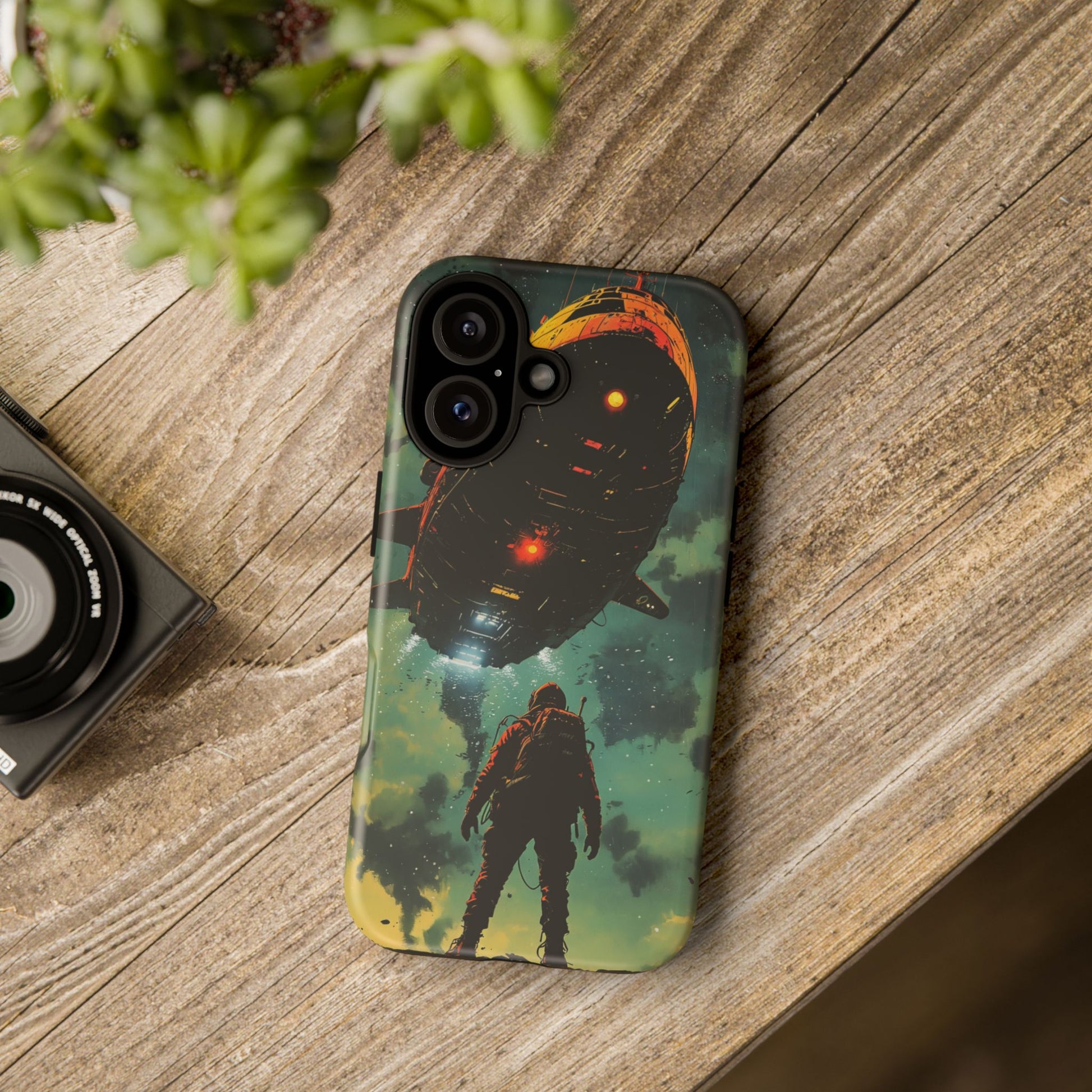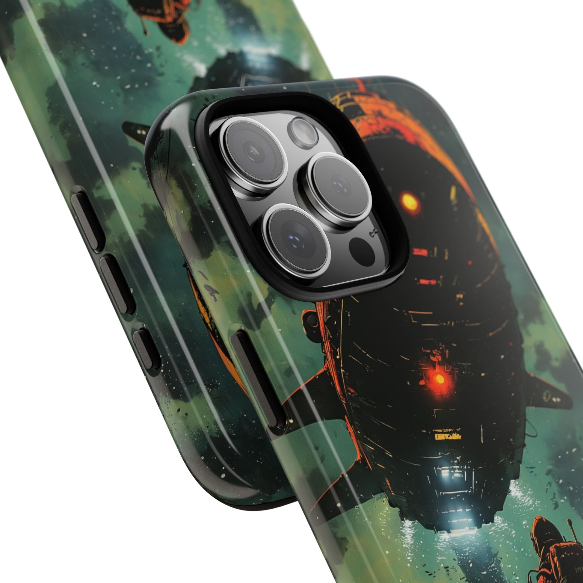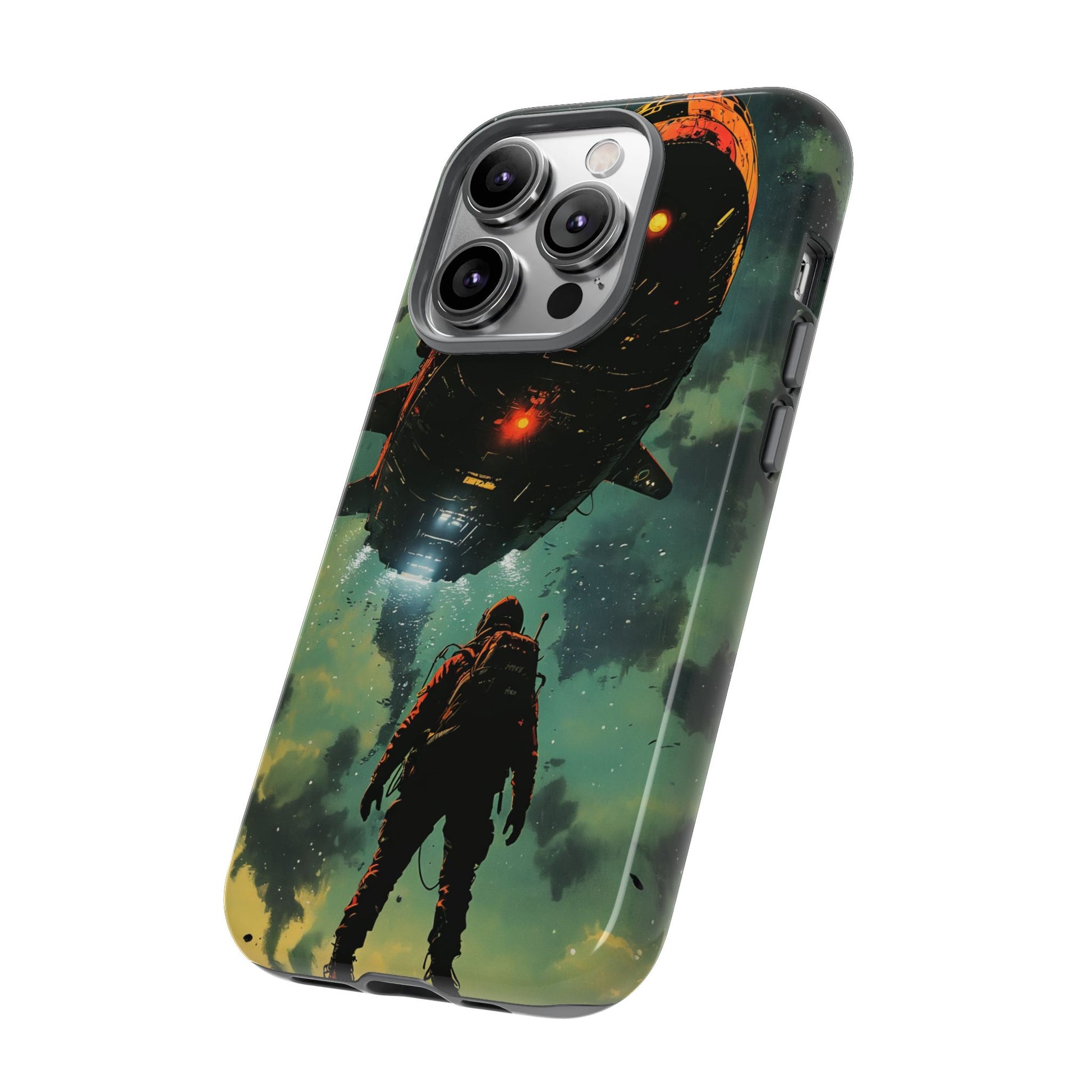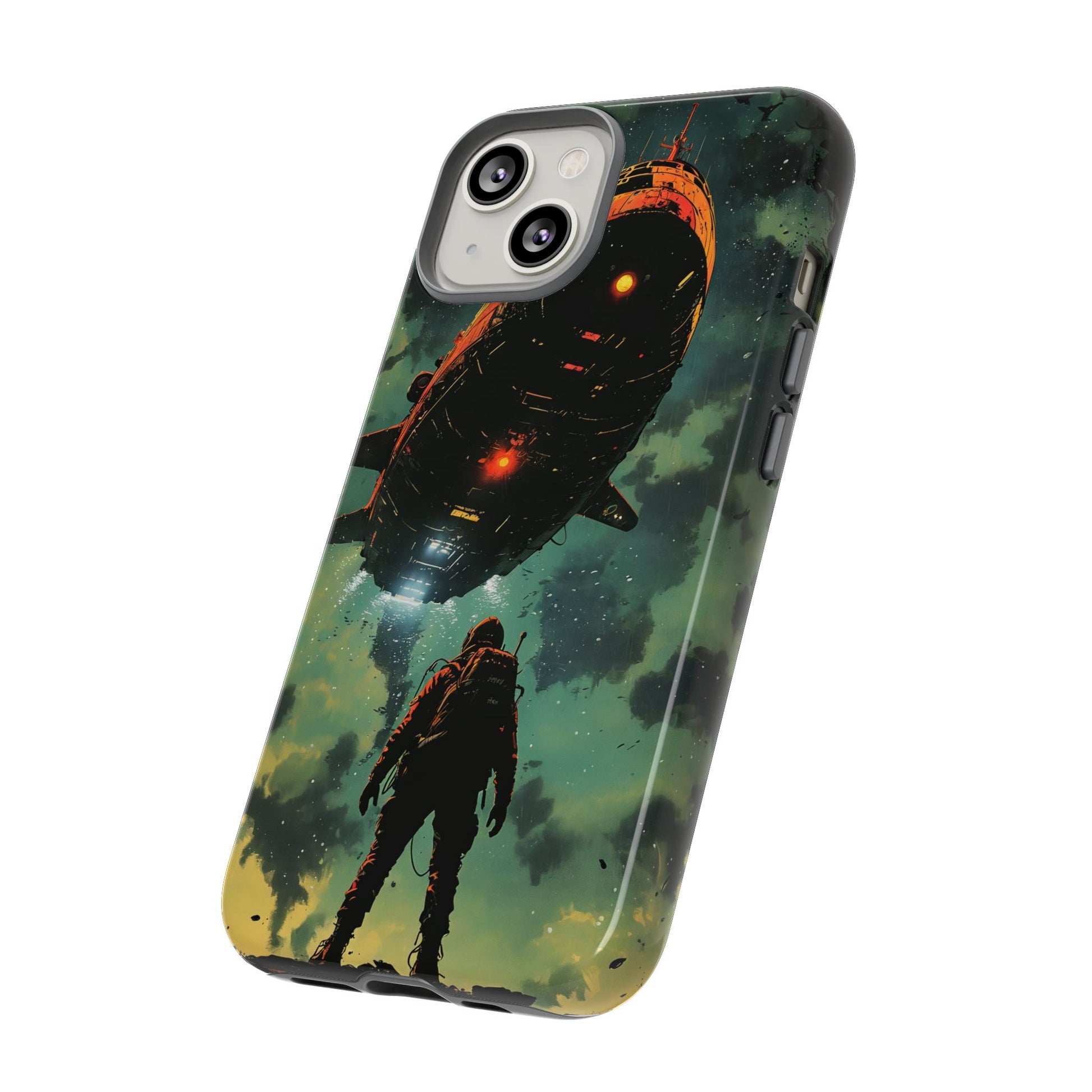 At the core of this design lies a portrayal of a lone spaceship, drifting through the vast, inky expanse of the universe. The ship is small against the backdrop of infinite darkness, emphasizing the themes of solitude and isolation. Its sleek, angular lines and dim, pulsating lights convey a sense of advanced technology and the stark realities of space travel.