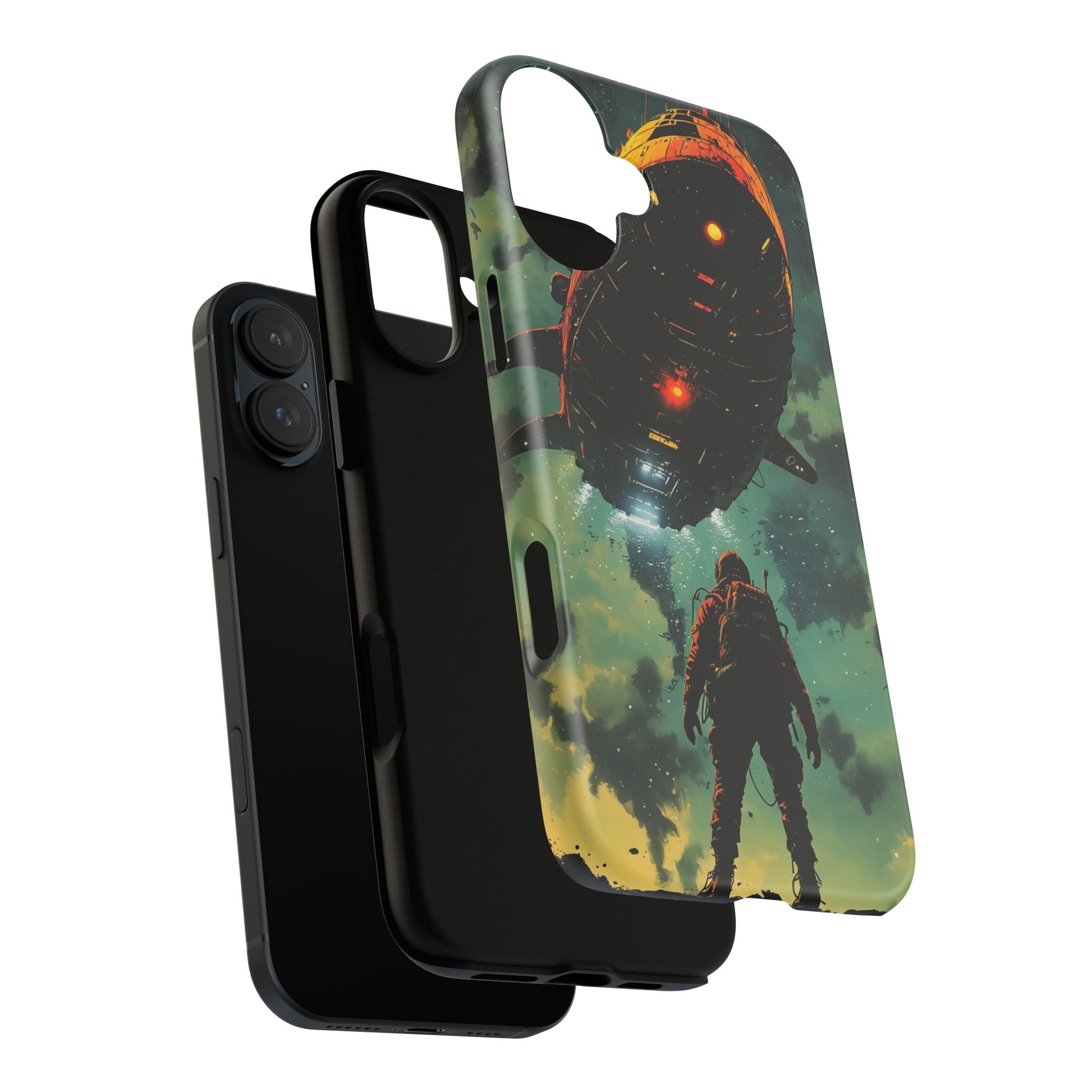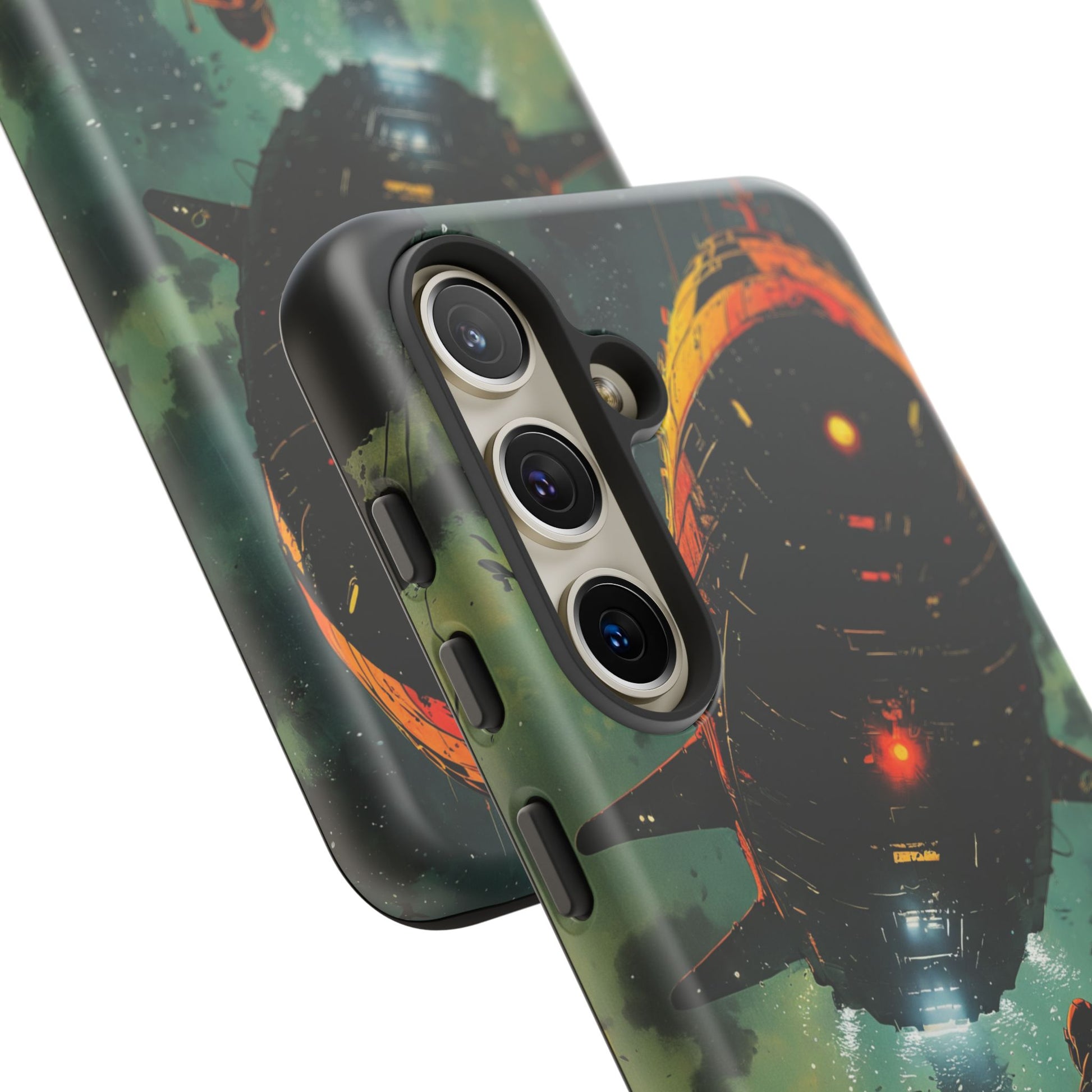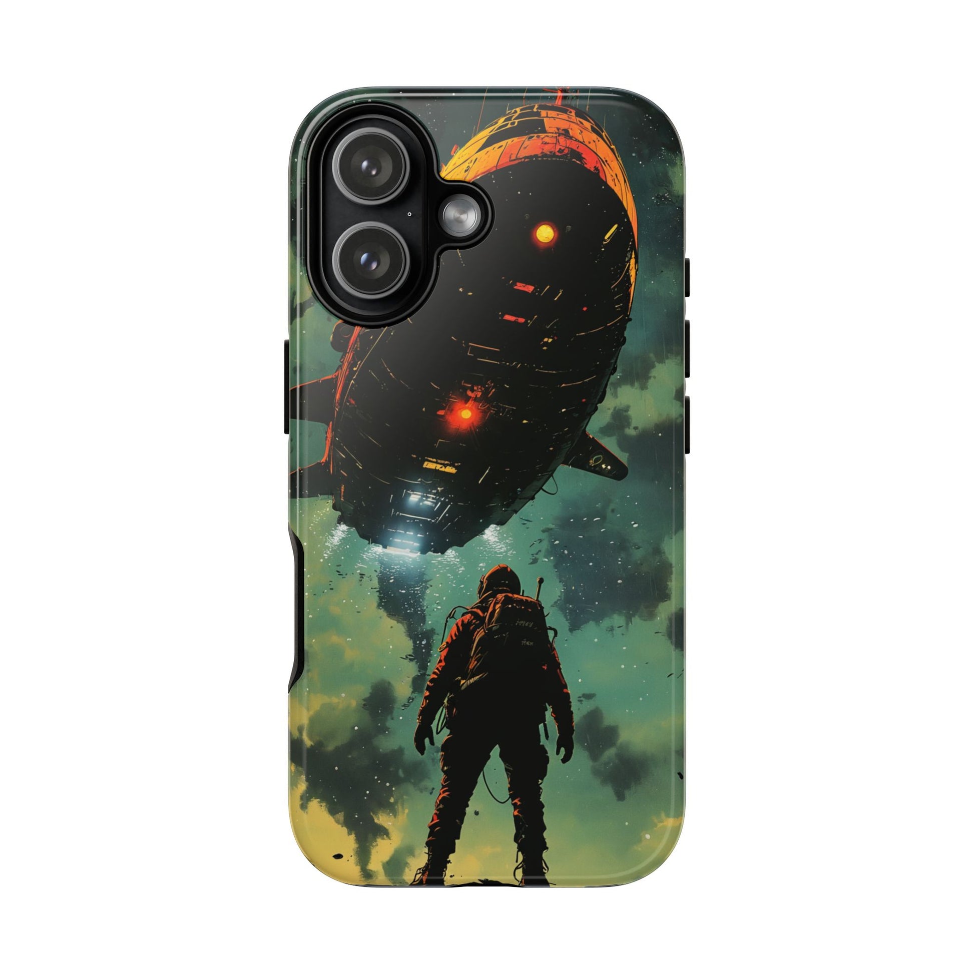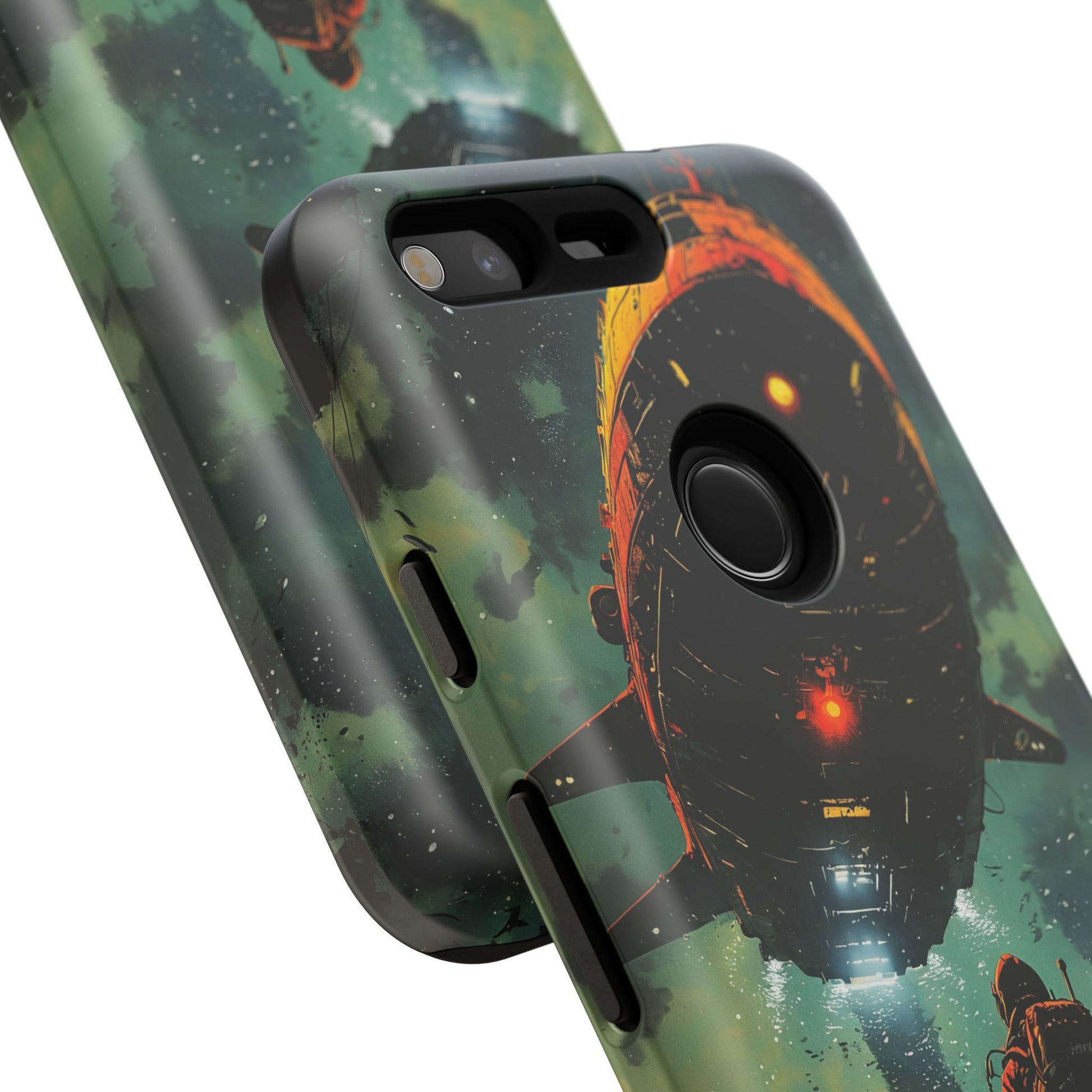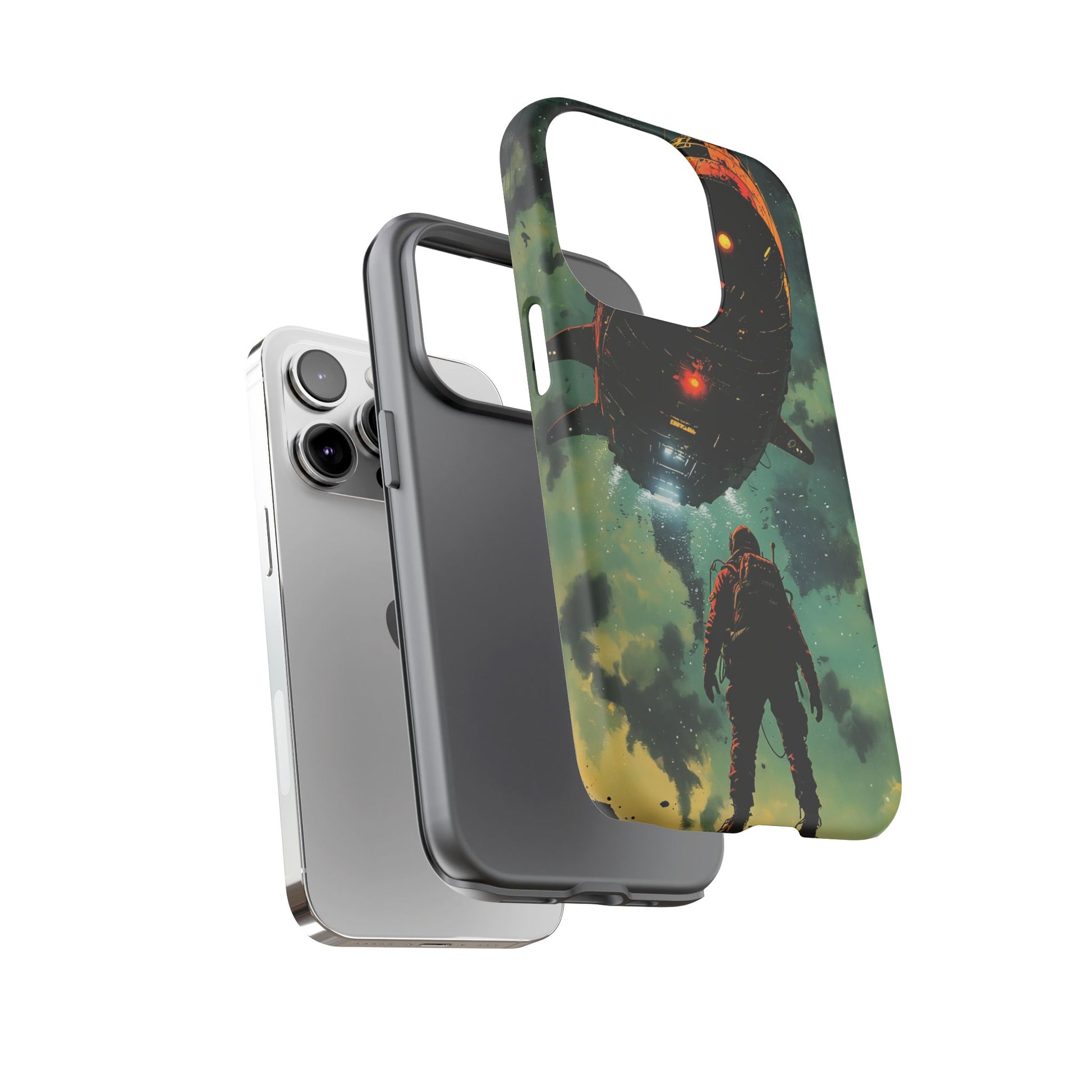 At the core of this design lies a portrayal of a lone spaceship, drifting through the vast, inky expanse of the universe. The ship is small against the backdrop of infinite darkness, emphasizing the themes of solitude and isolation. Its sleek, angular lines and dim, pulsating lights convey a sense of advanced technology and the stark realities of space travel.