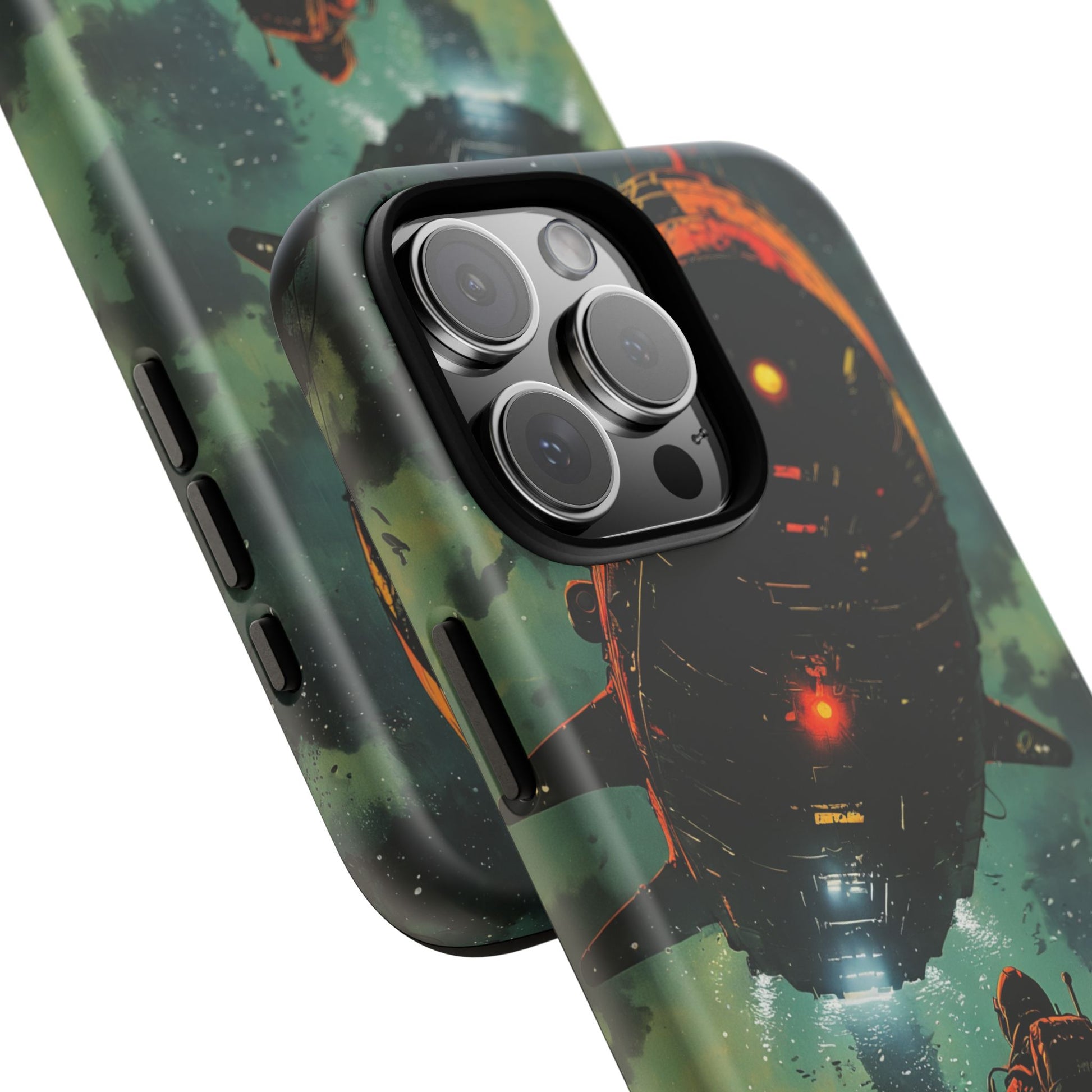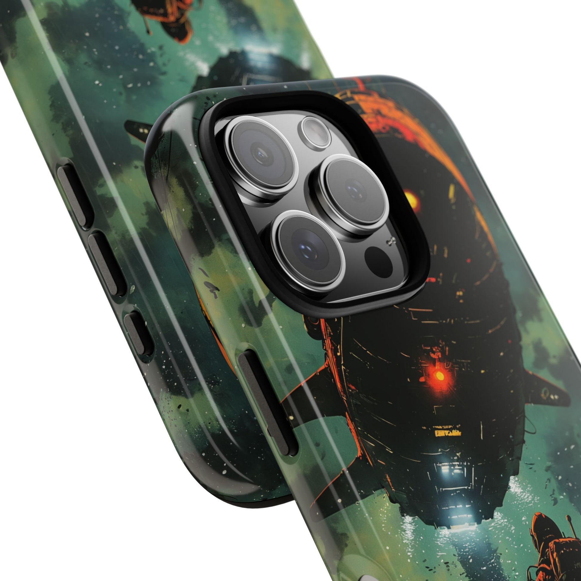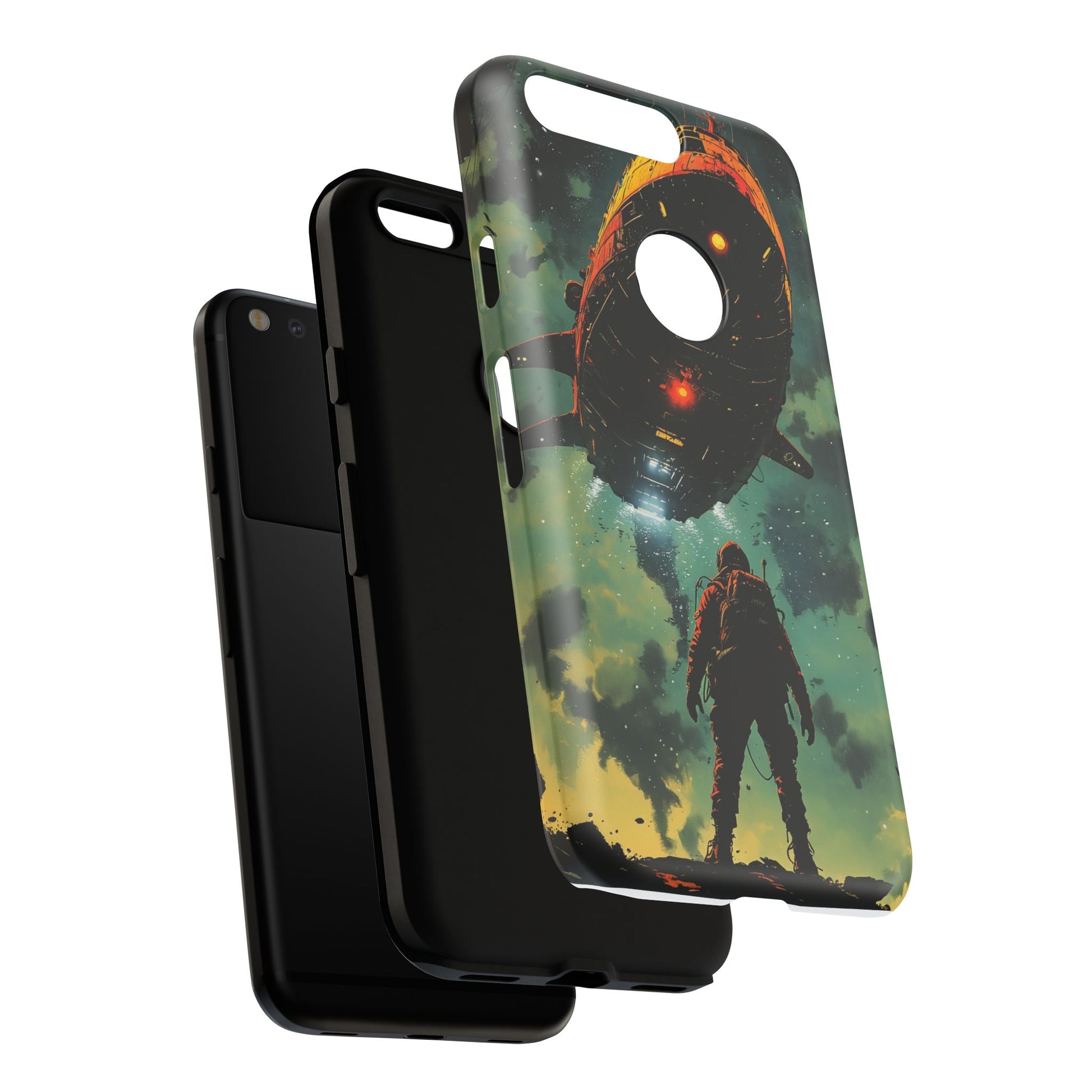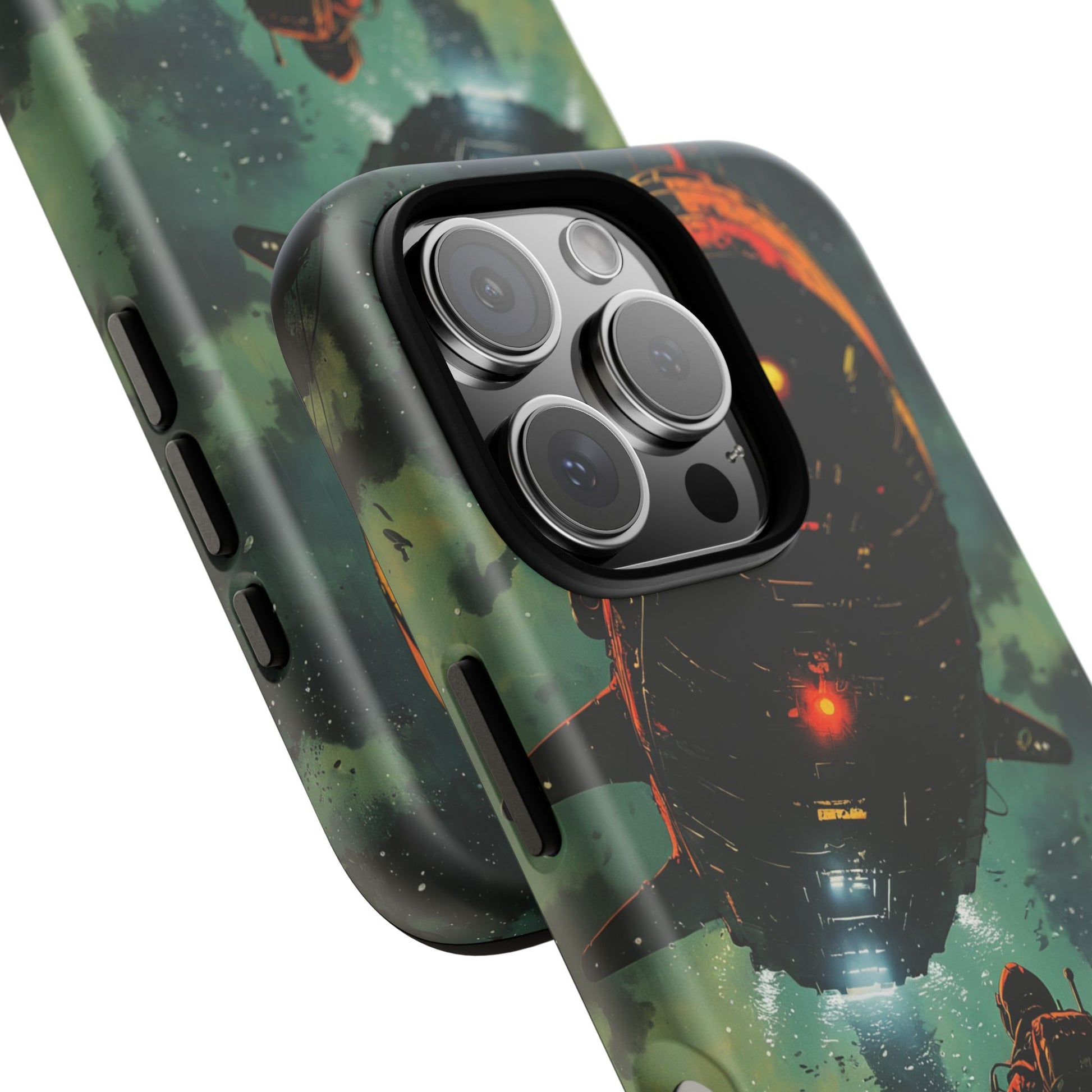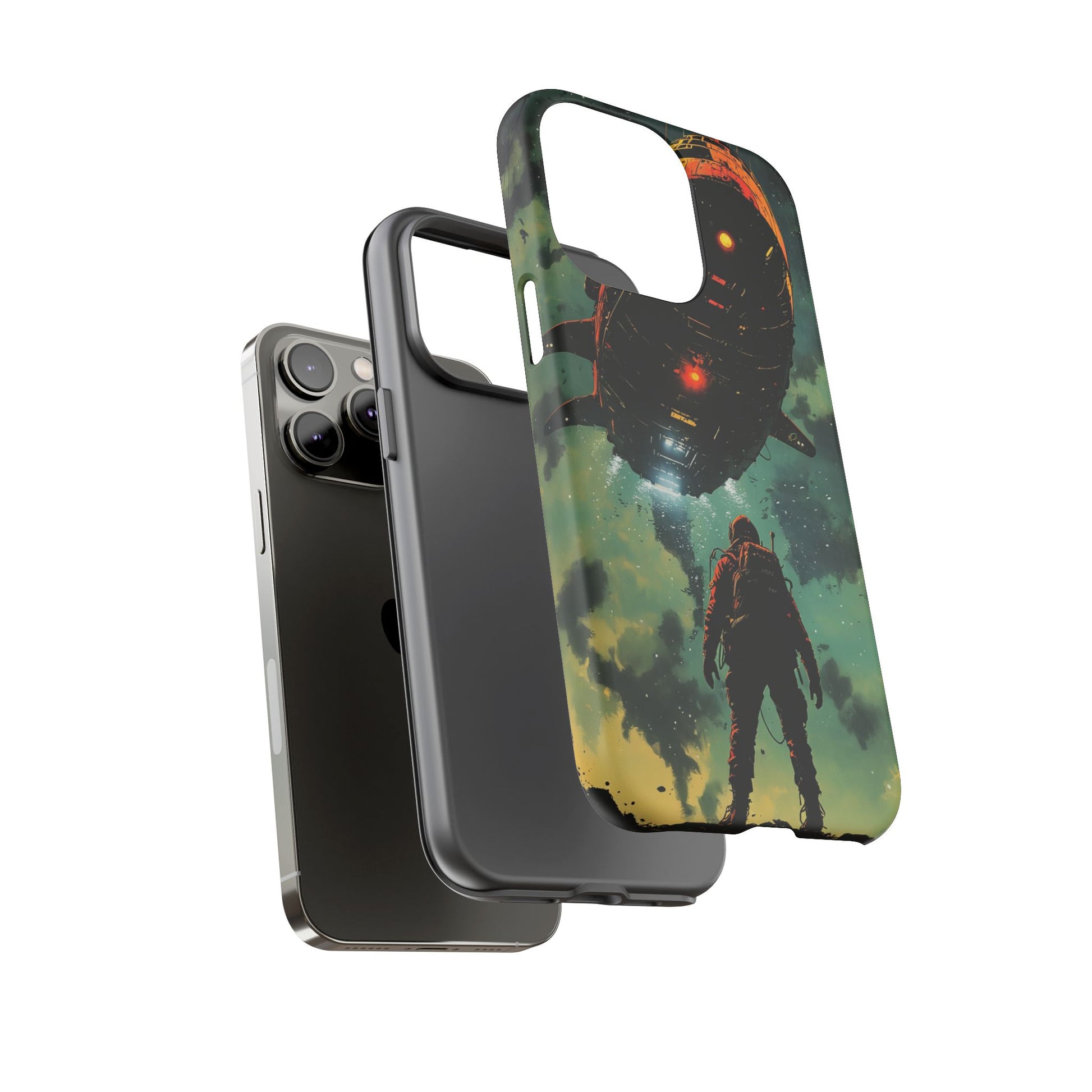 At the core of this design lies a portrayal of a lone spaceship, drifting through the vast, inky expanse of the universe. The ship is small against the backdrop of infinite darkness, emphasizing the themes of solitude and isolation. Its sleek, angular lines and dim, pulsating lights convey a sense of advanced technology and the stark realities of space travel.