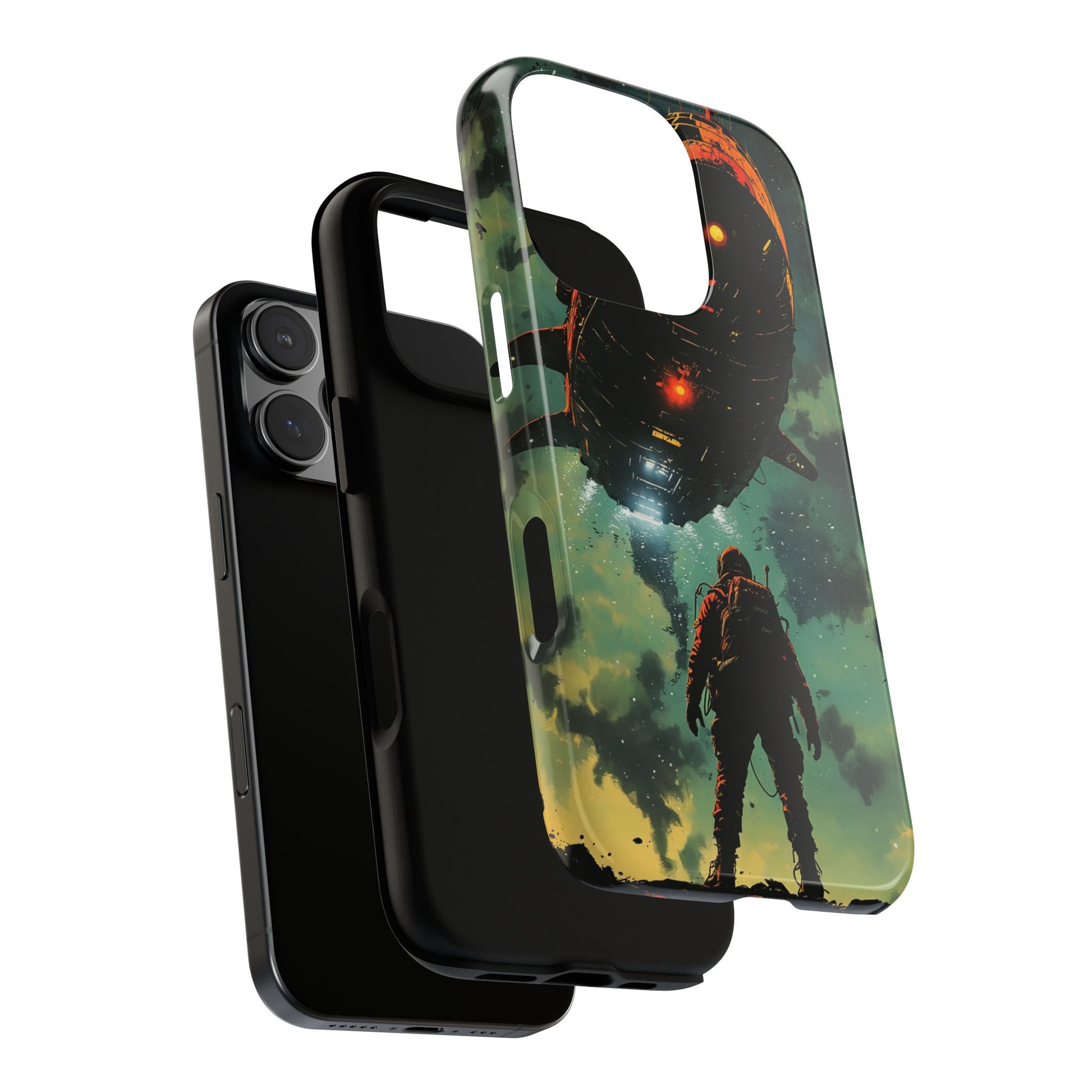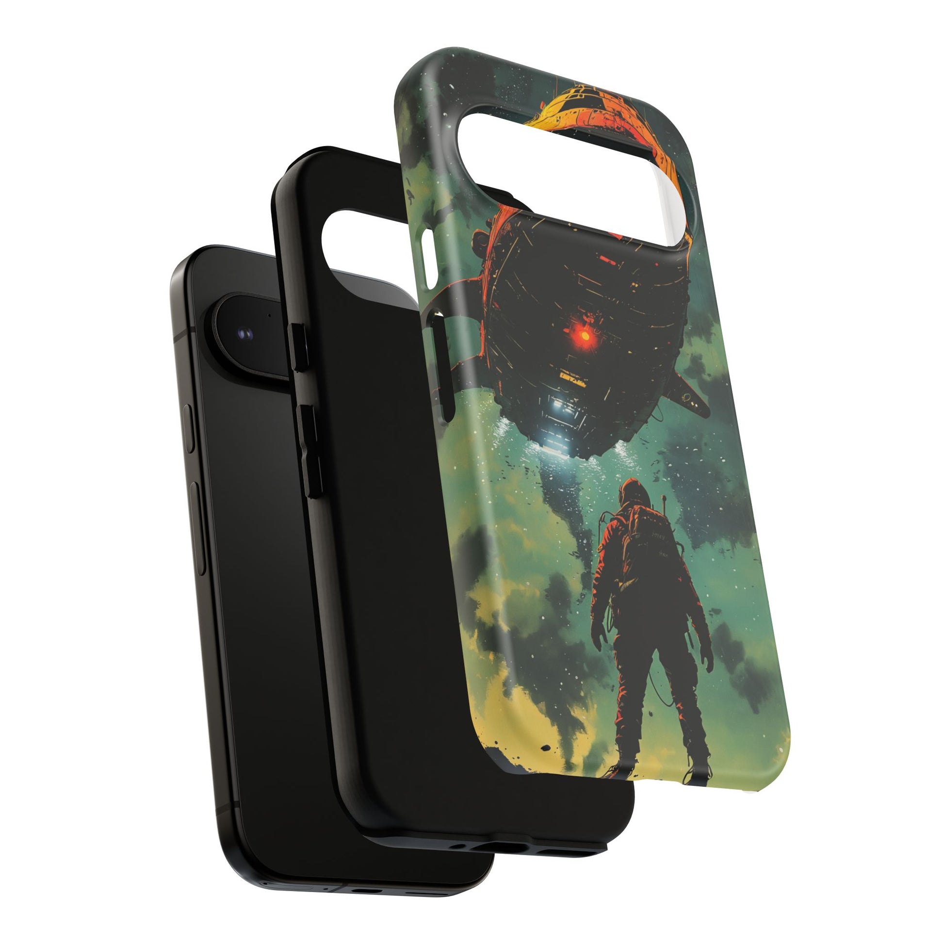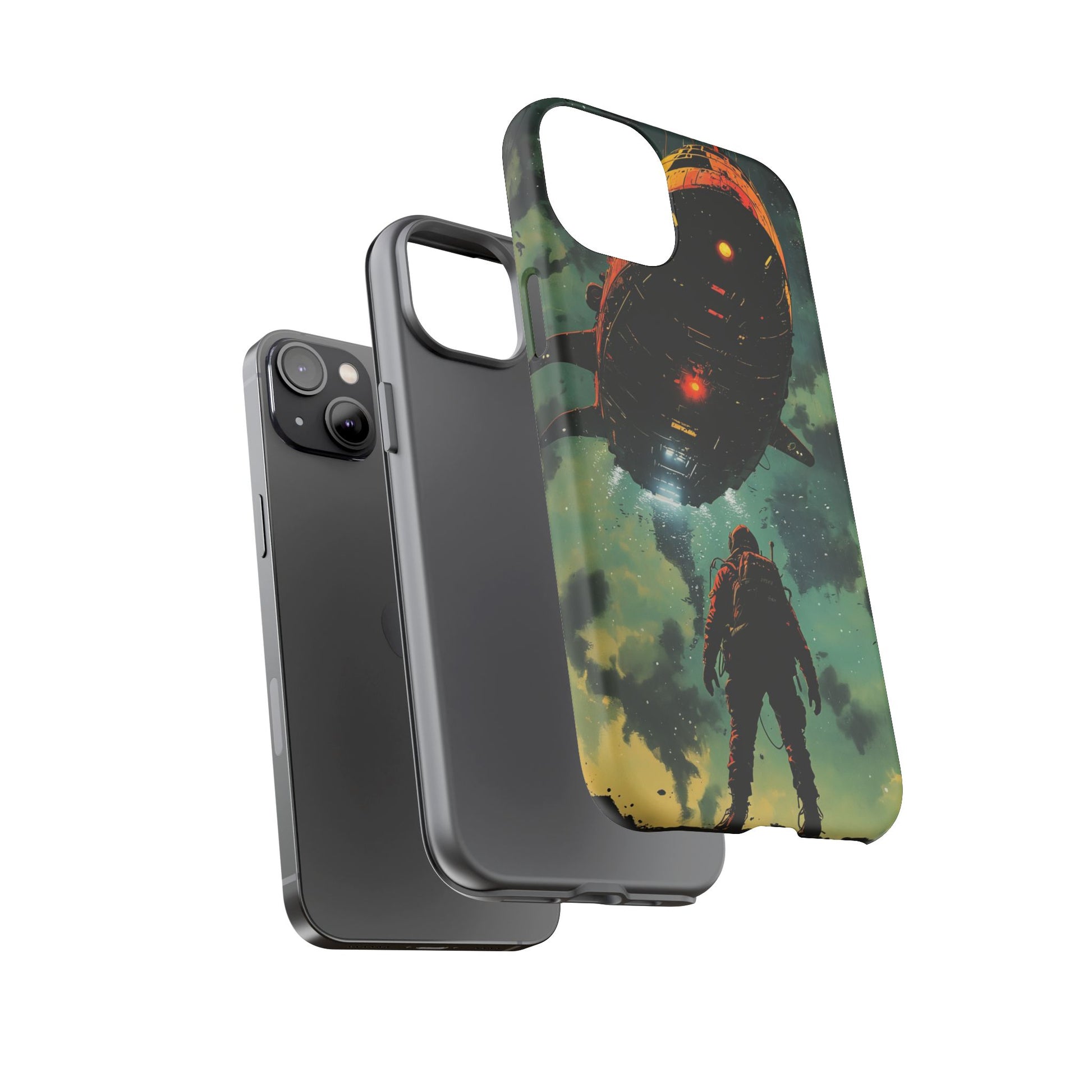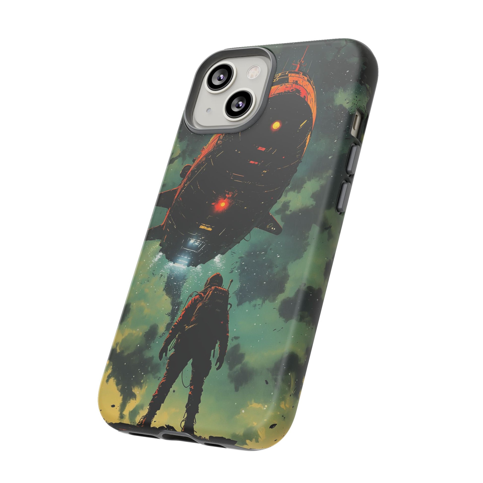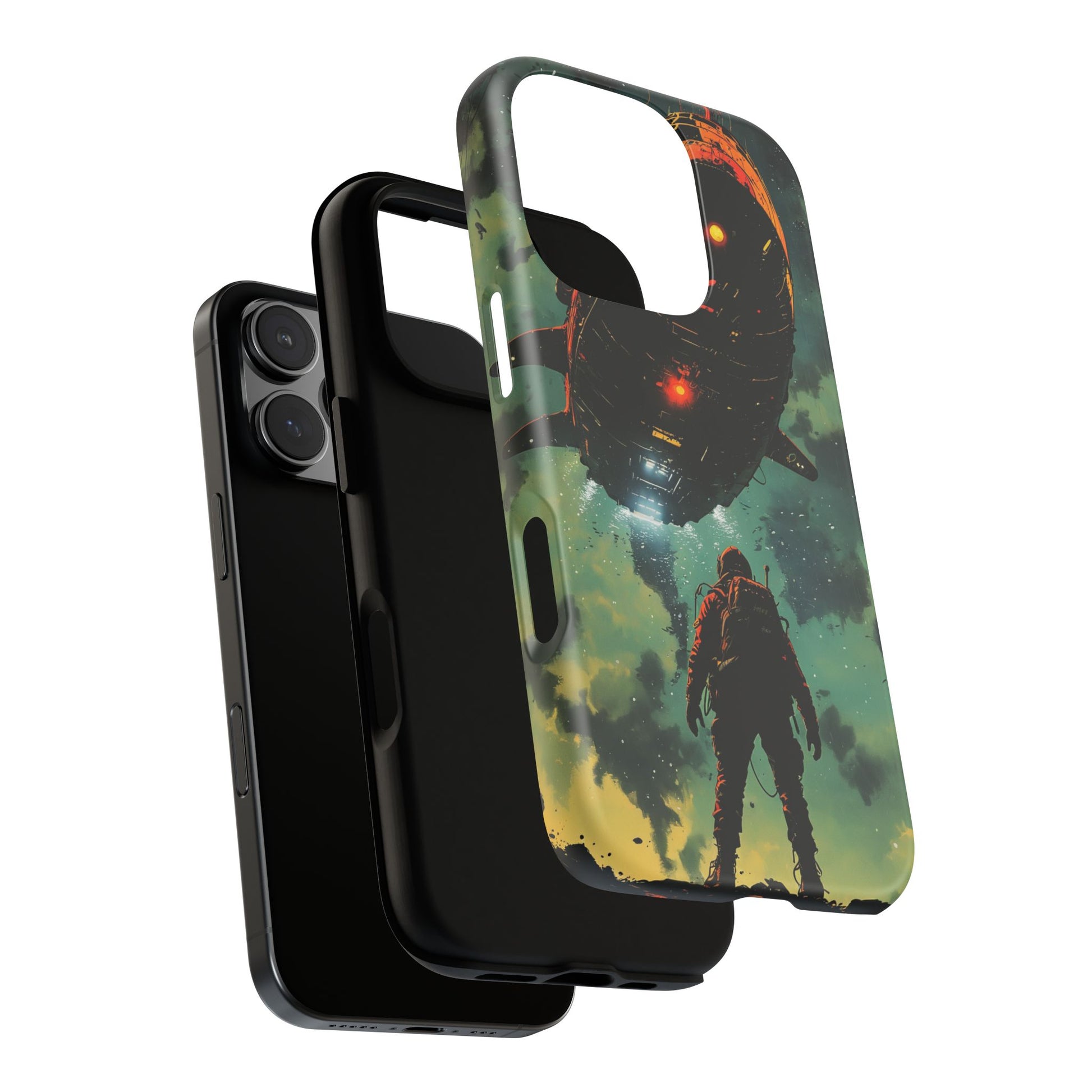 At the core of this design lies a portrayal of a lone spaceship, drifting through the vast, inky expanse of the universe. The ship is small against the backdrop of infinite darkness, emphasizing the themes of solitude and isolation. Its sleek, angular lines and dim, pulsating lights convey a sense of advanced technology and the stark realities of space travel.