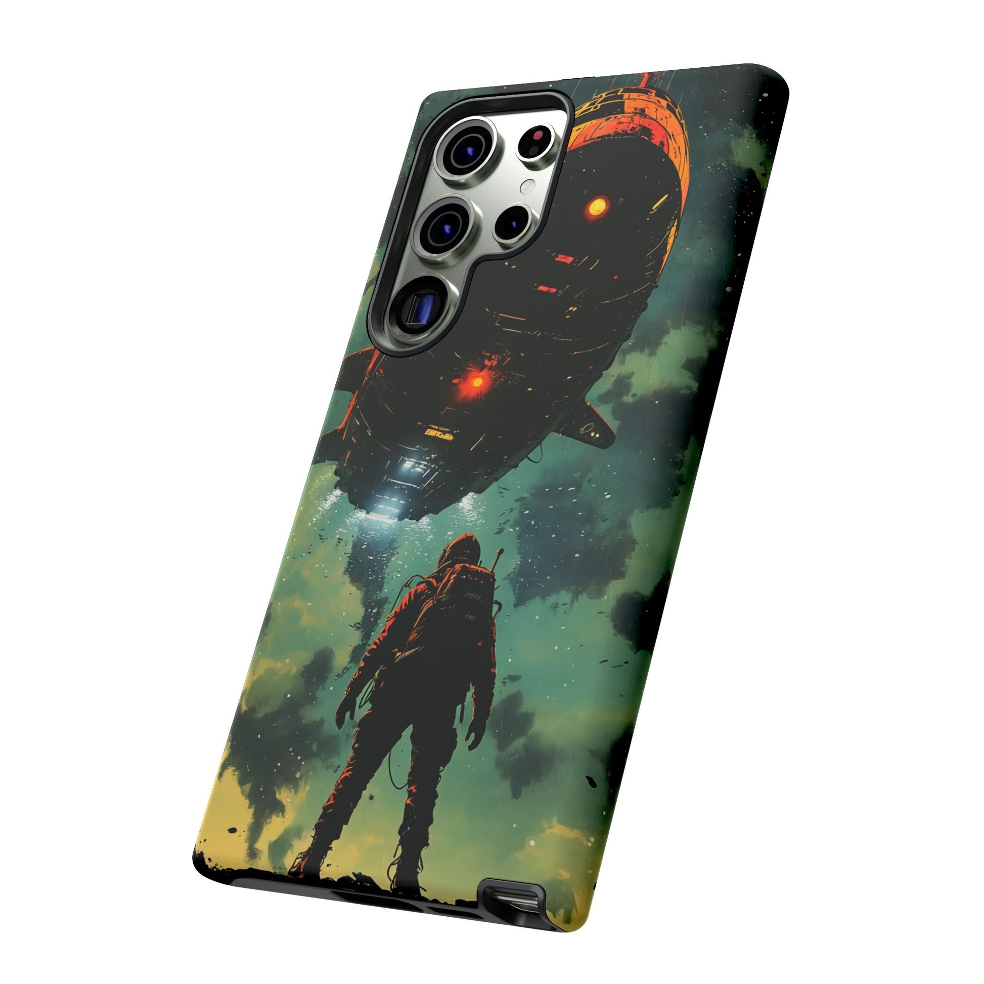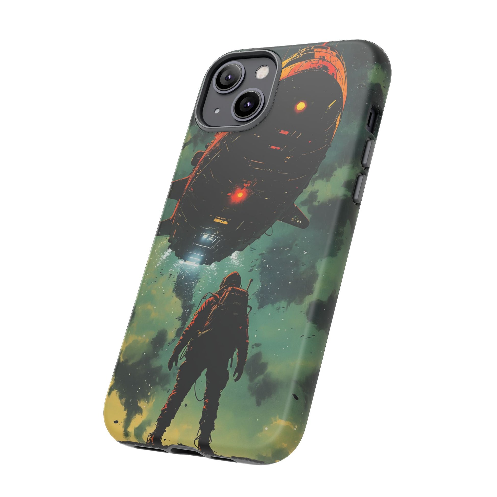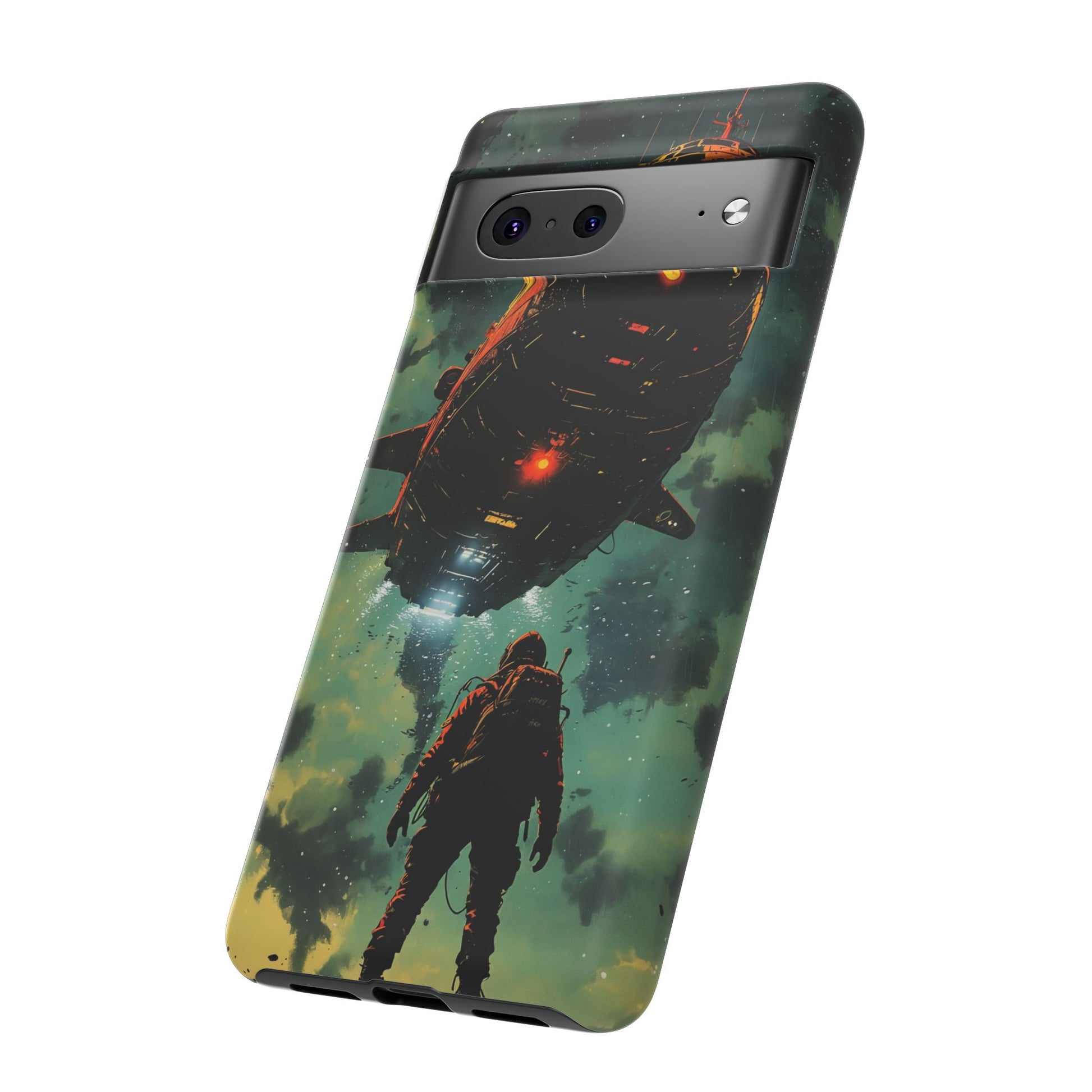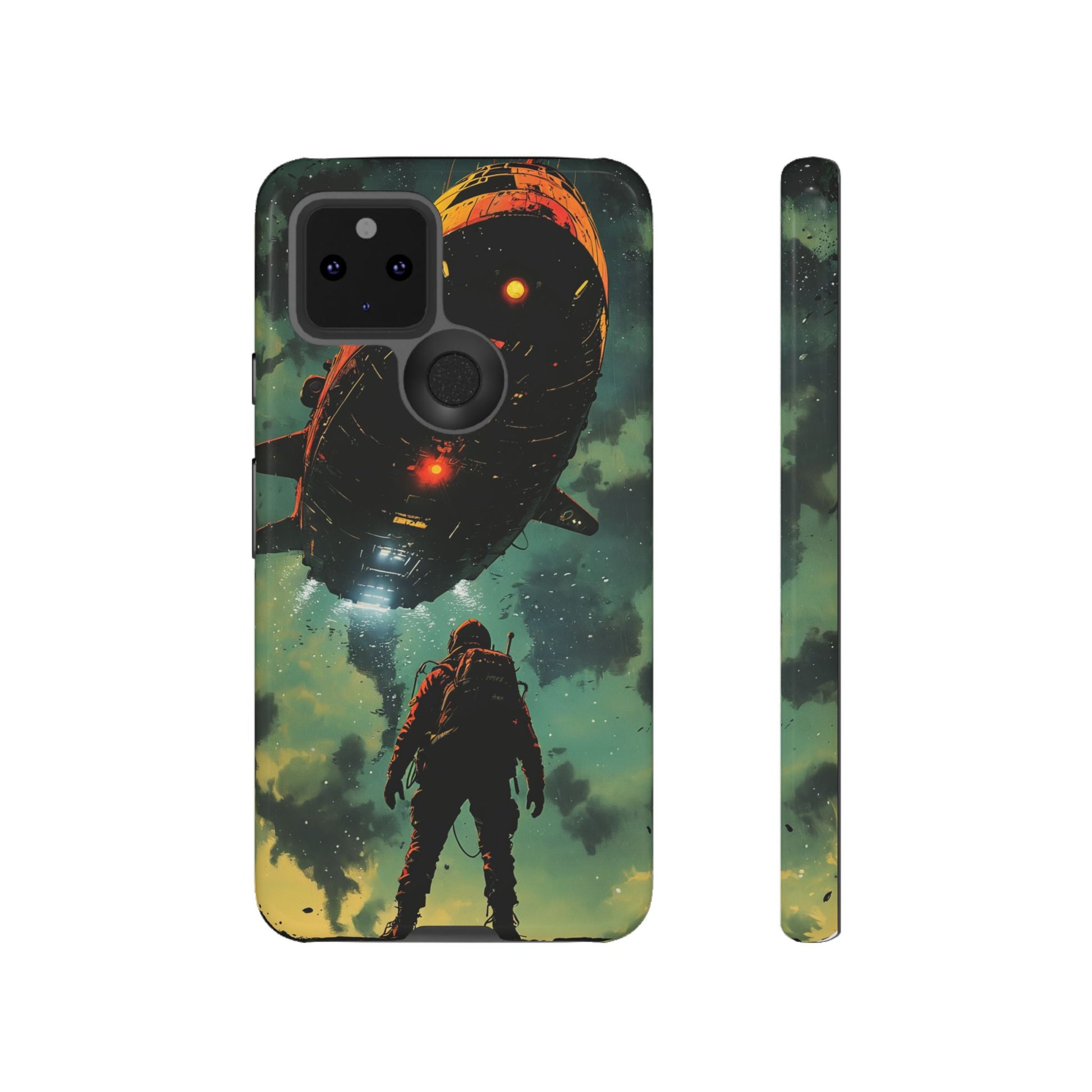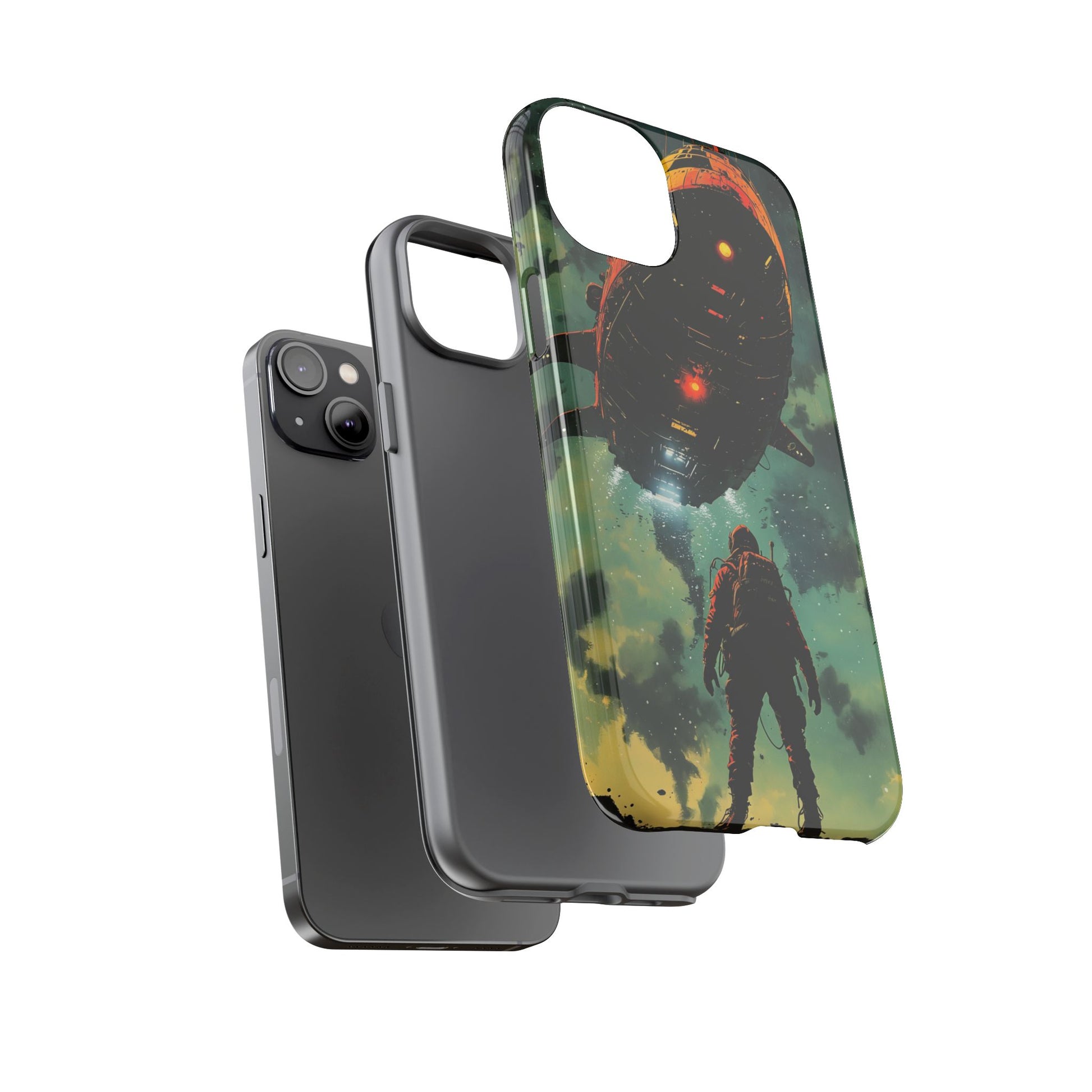 At the core of this design lies a portrayal of a lone spaceship, drifting through the vast, inky expanse of the universe. The ship is small against the backdrop of infinite darkness, emphasizing the themes of solitude and isolation. Its sleek, angular lines and dim, pulsating lights convey a sense of advanced technology and the stark realities of space travel.