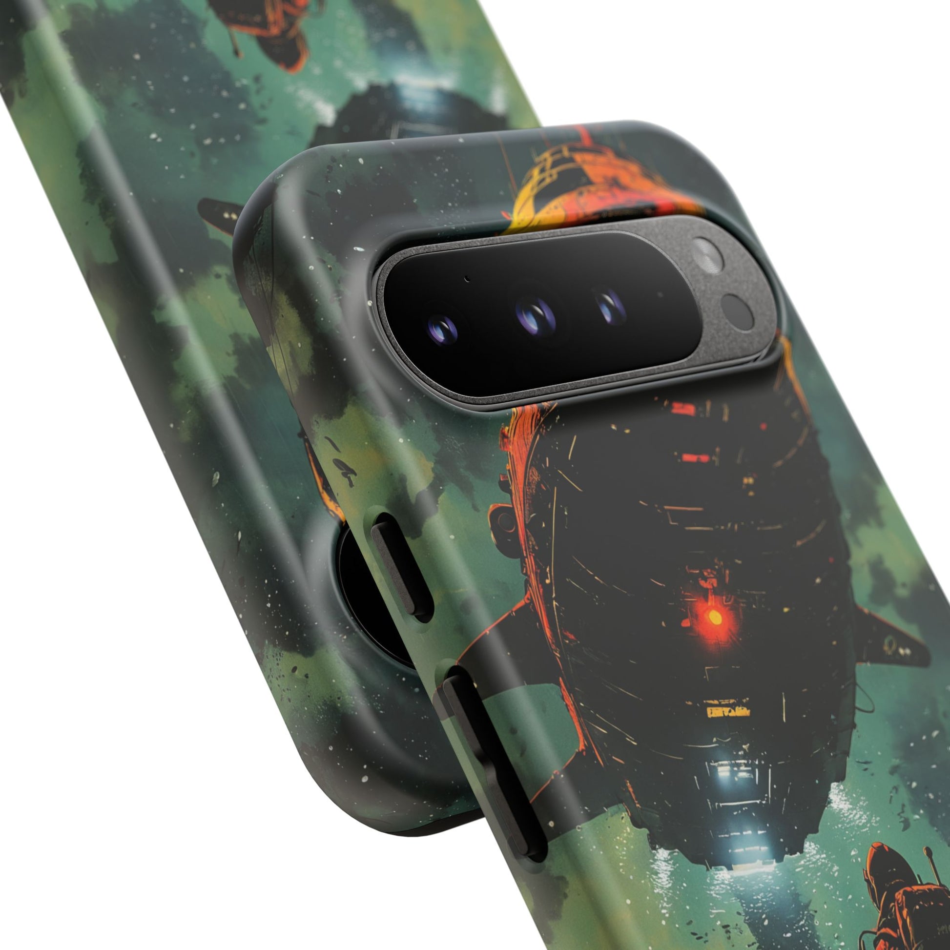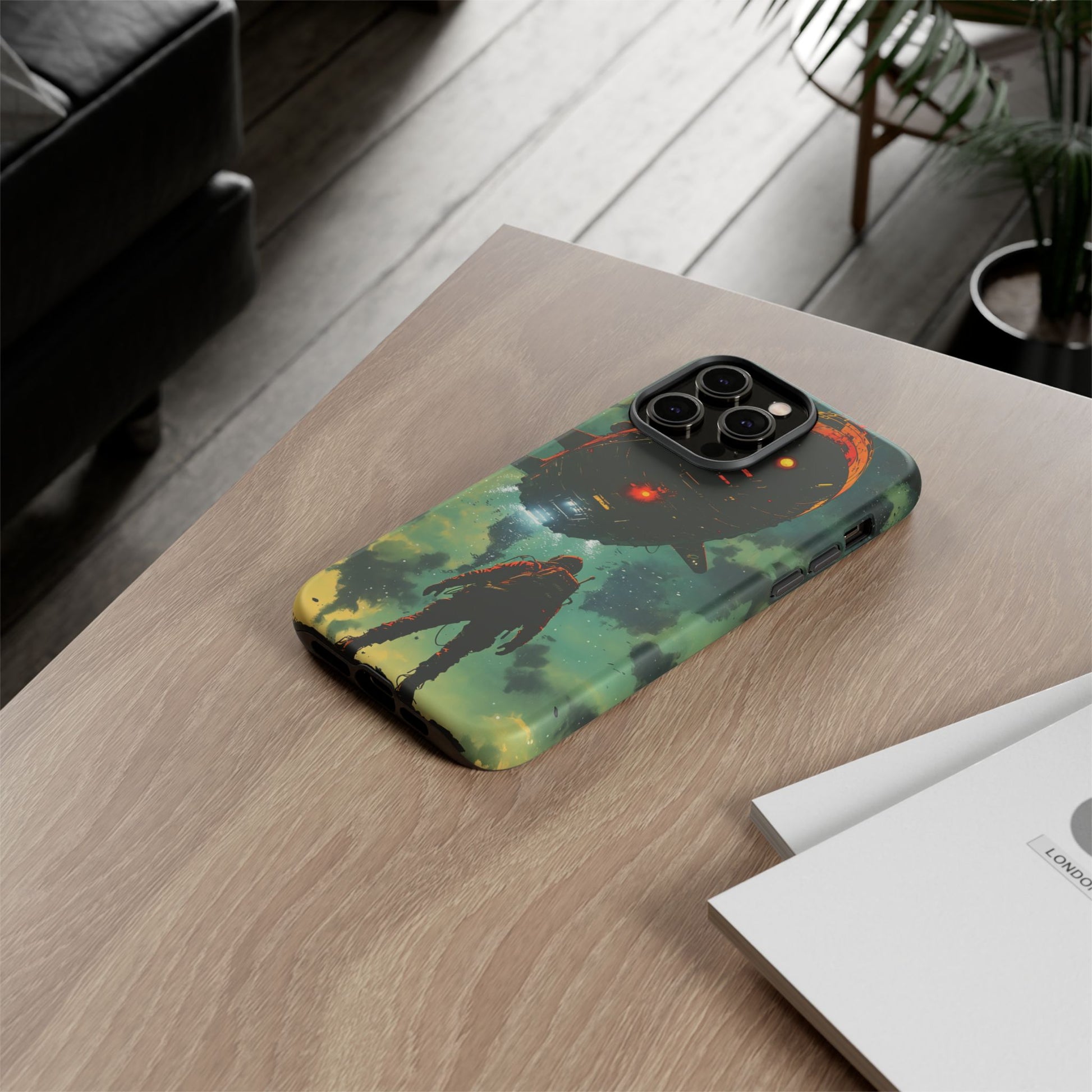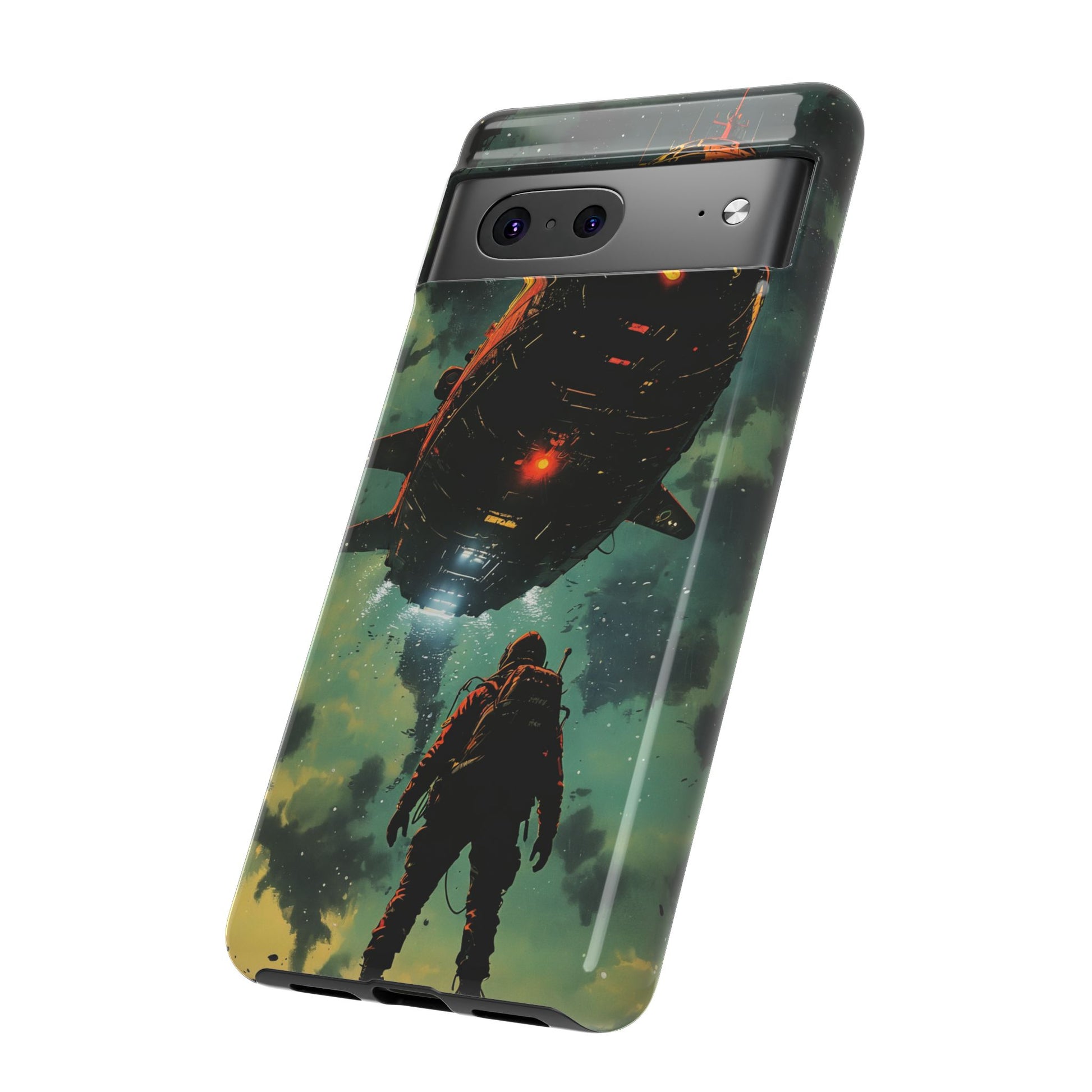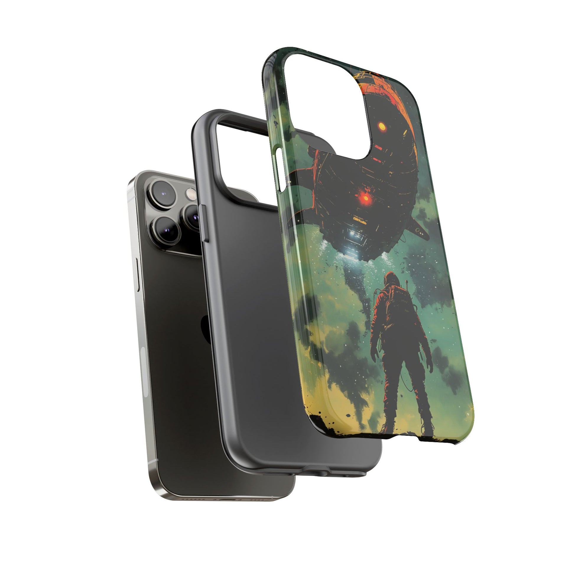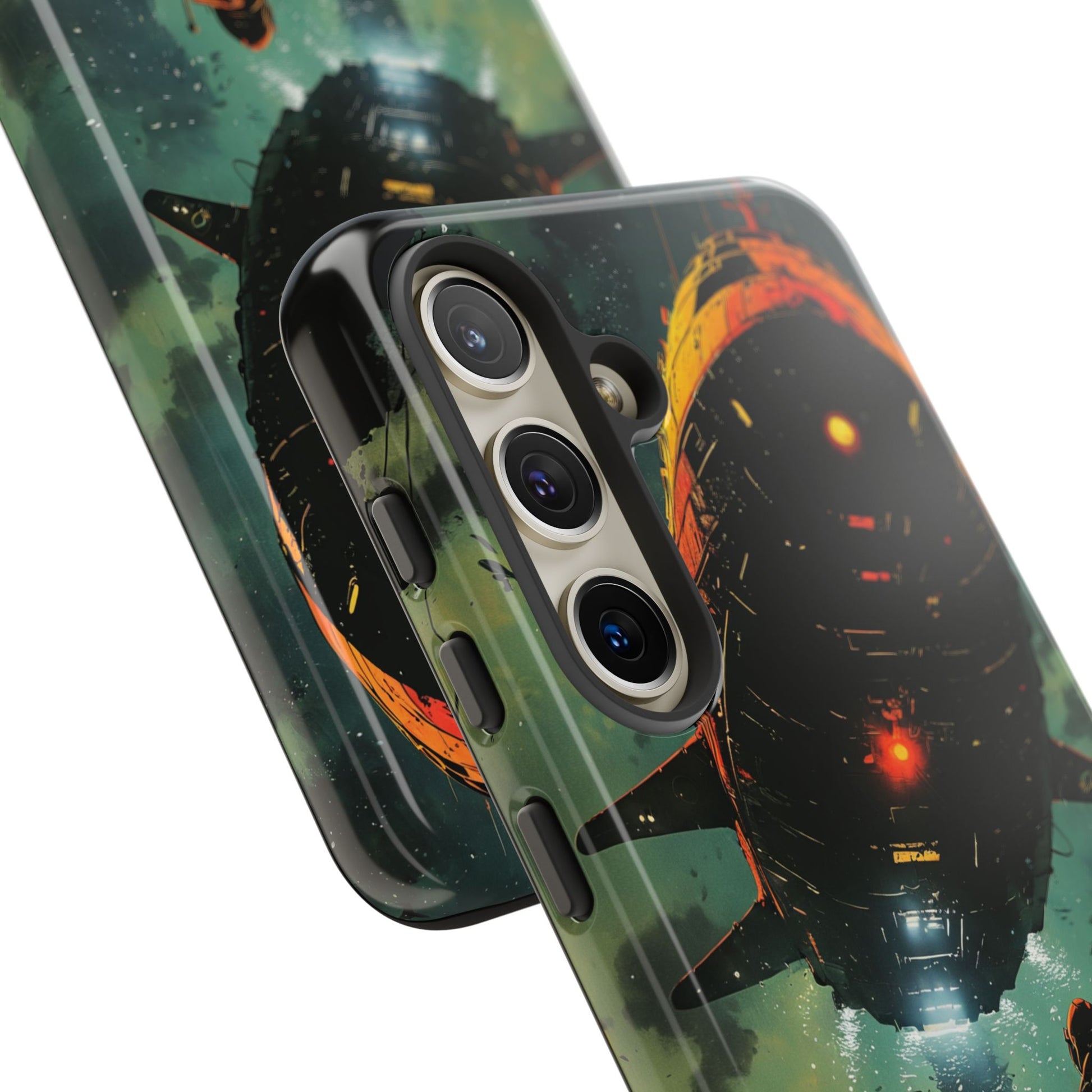 At the core of this design lies a portrayal of a lone spaceship, drifting through the vast, inky expanse of the universe. The ship is small against the backdrop of infinite darkness, emphasizing the themes of solitude and isolation. Its sleek, angular lines and dim, pulsating lights convey a sense of advanced technology and the stark realities of space travel.