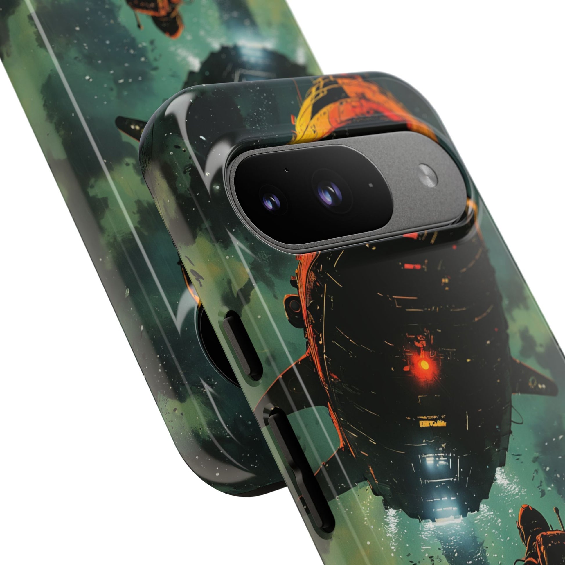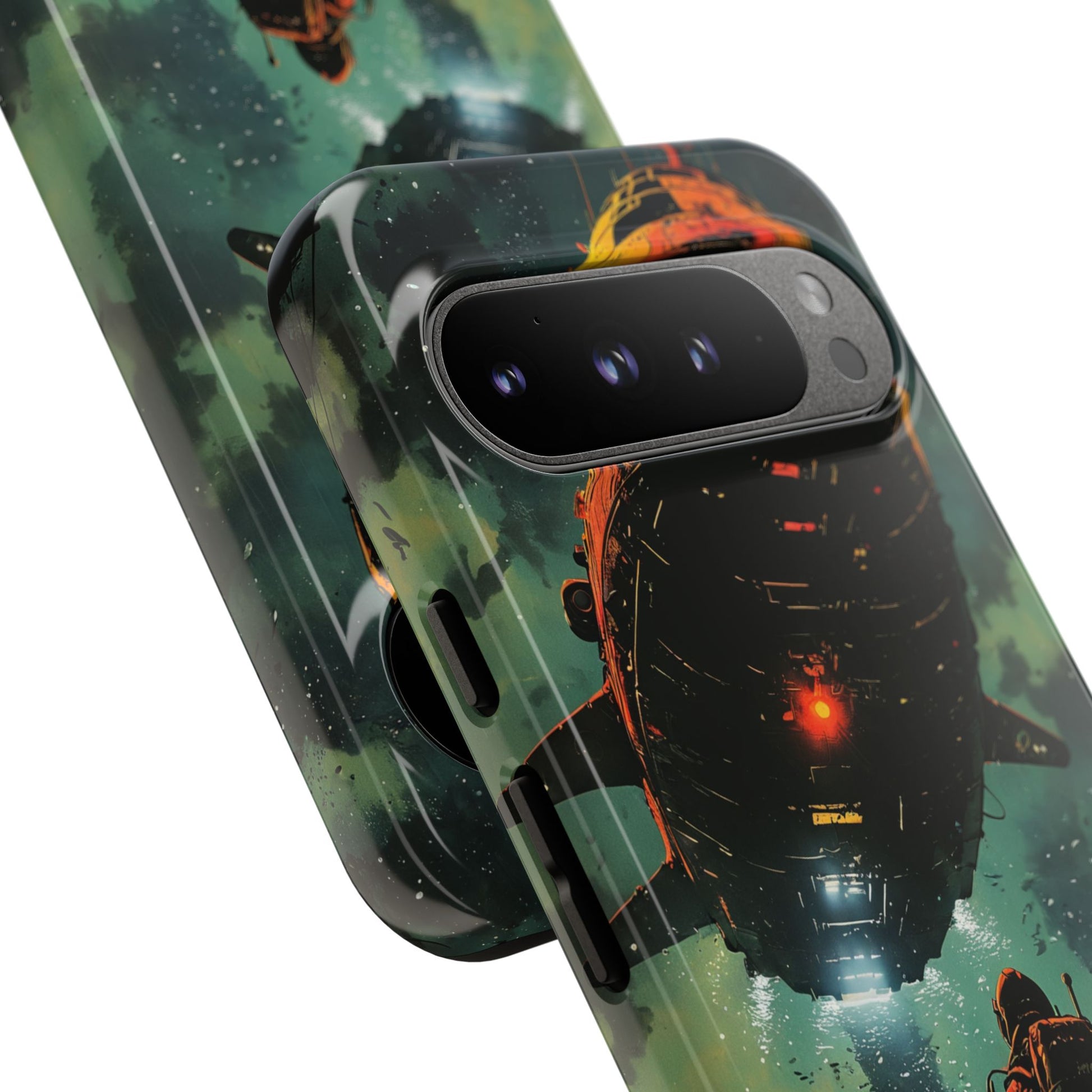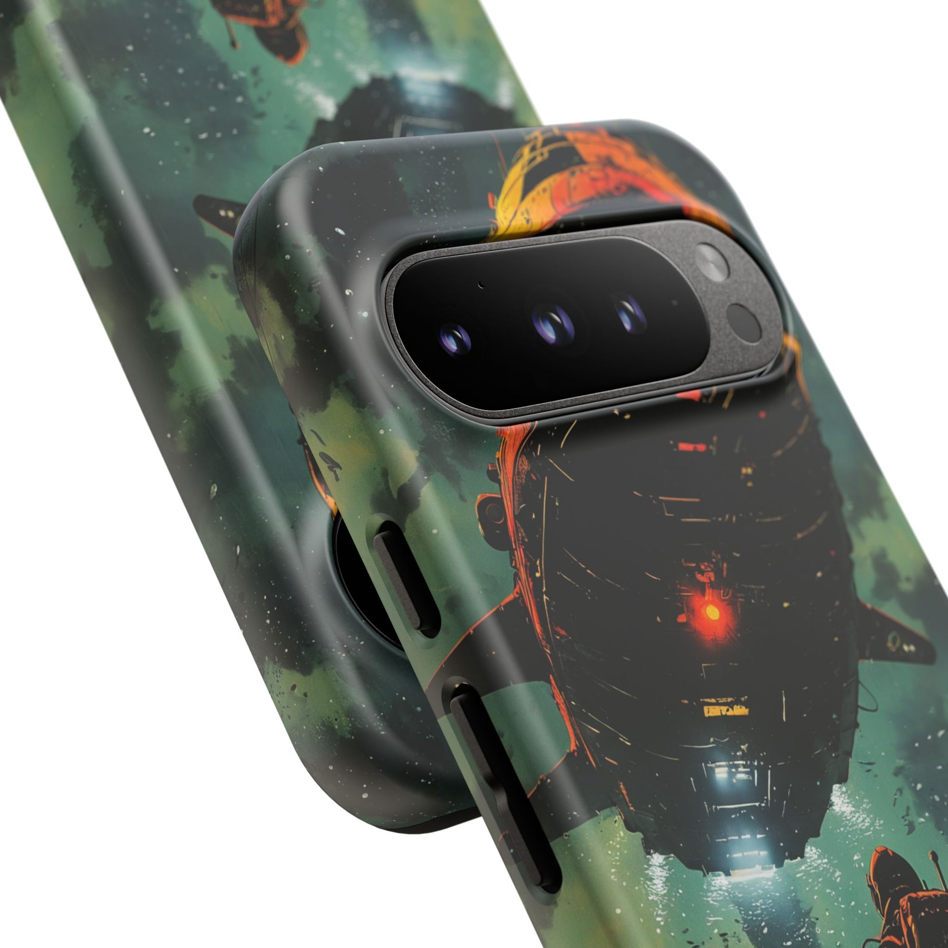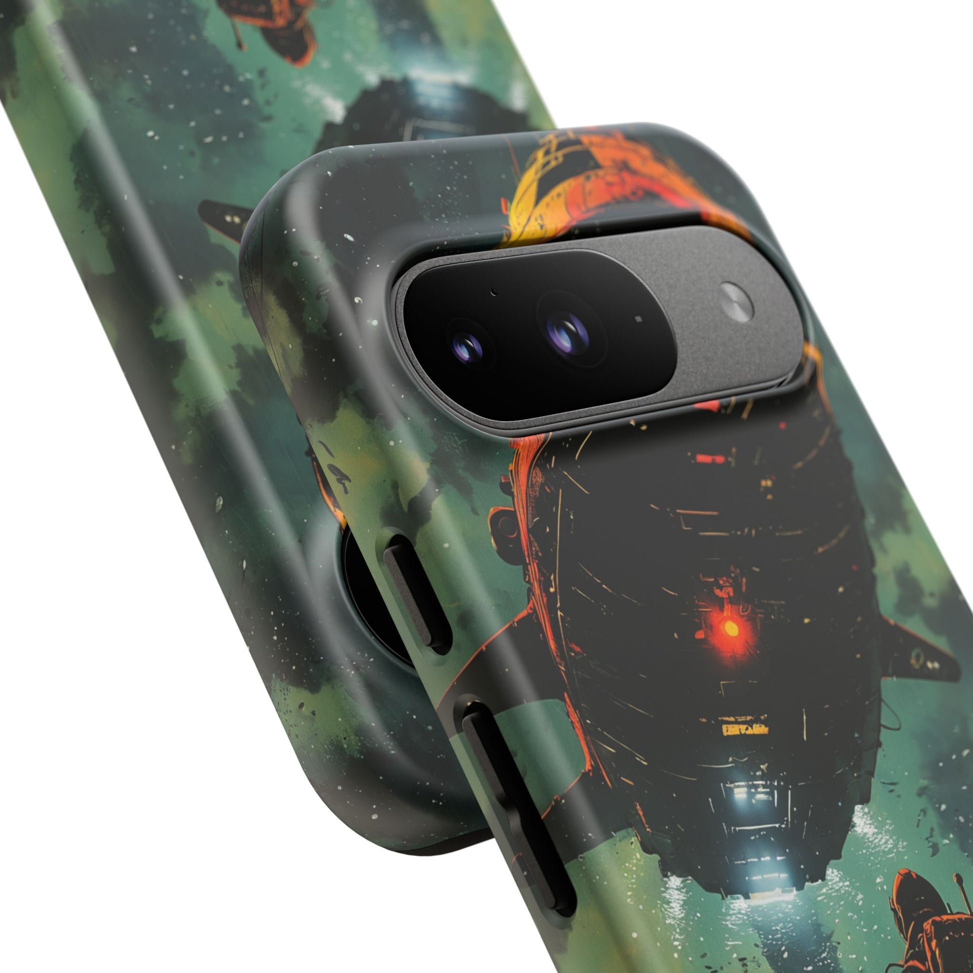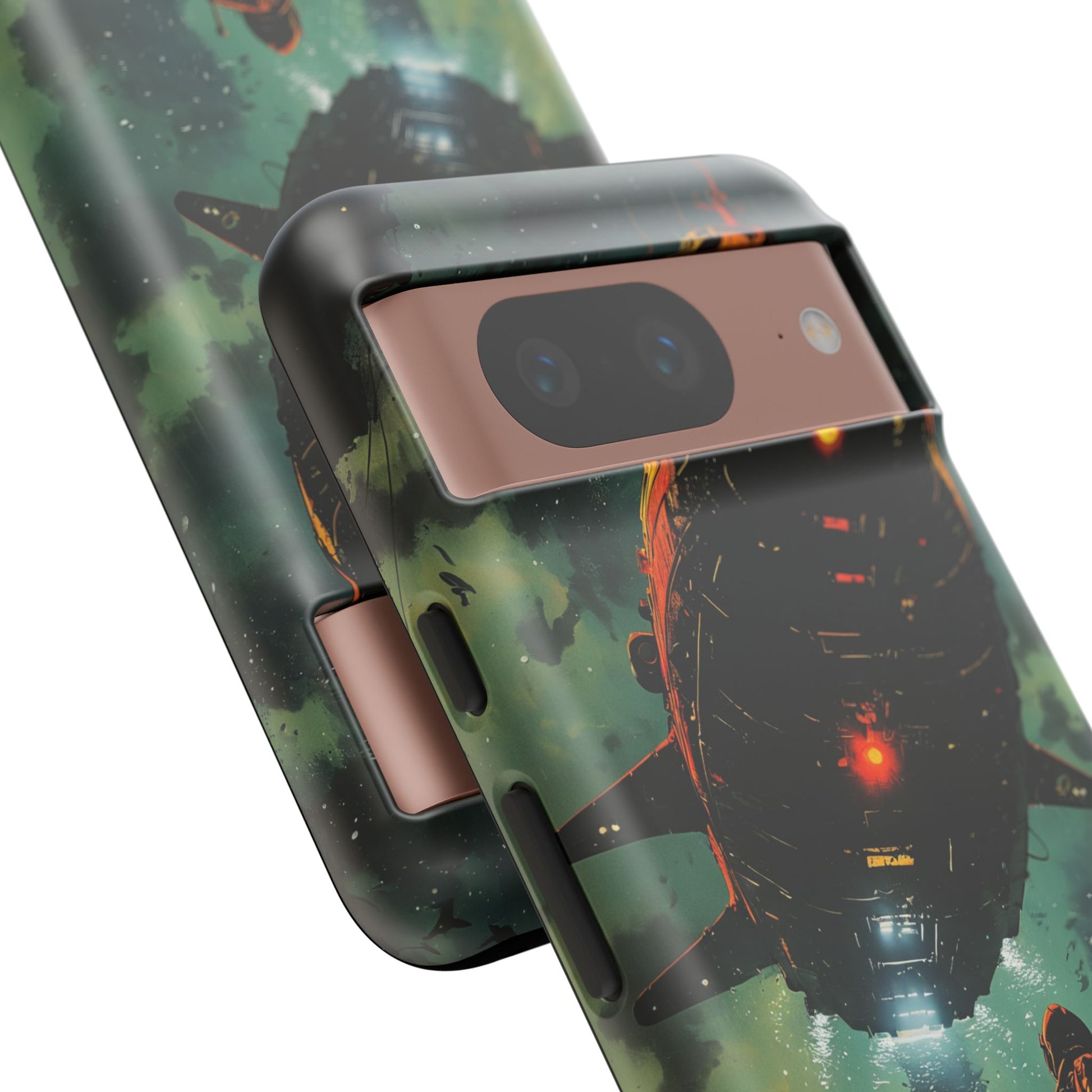 At the core of this design lies a portrayal of a lone spaceship, drifting through the vast, inky expanse of the universe. The ship is small against the backdrop of infinite darkness, emphasizing the themes of solitude and isolation. Its sleek, angular lines and dim, pulsating lights convey a sense of advanced technology and the stark realities of space travel.